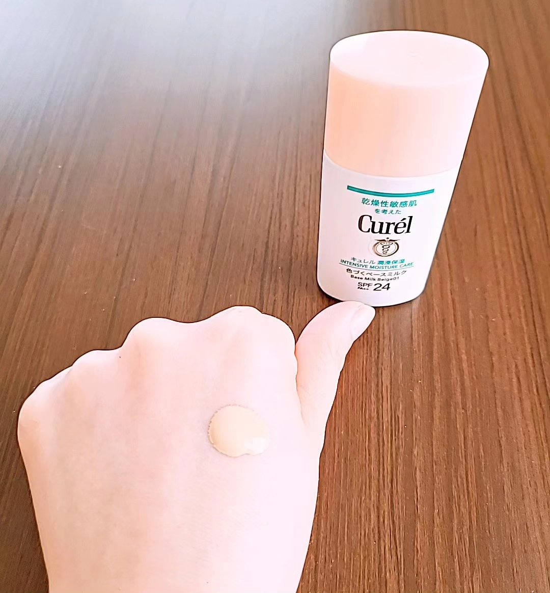 〖キュレル潤浸保湿色づくベースミルクベージュ02〗サンプルの使用です。自然な肌色だけどかなり色が濃くて褐色肌に😭薄く伸びて密着するから軽めにベースしたい日には良さそうだけど、01も結構暗そうだからカラバリ増えて欲しい😭使用感は好きなのに😭...