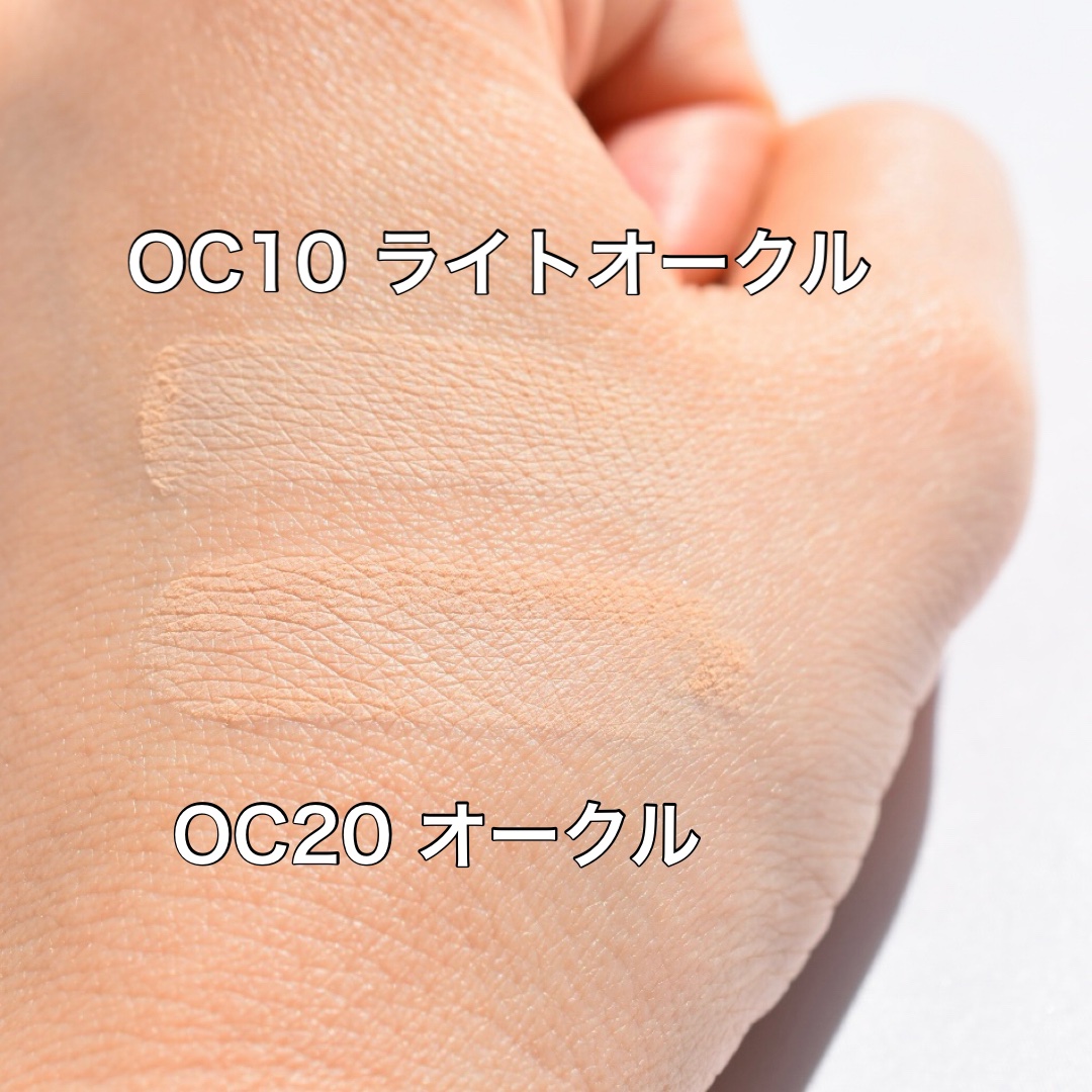 - <OC10,20共通> 配合成分:タルク、合成金雲母、酸化チタン、窒化ホウ素、硫酸Ba、(HDI/トリメチロールヘキシルラクトン)クロスポリマー、ジメチコン、(ビニルジメチコン/メチコンシルセスキオキサン)クロスポリマー、メトキシケイヒ酸エチルヘキシル、酸化亜鉛、シリカ、マイカ、ミリスチン酸亜鉛、甘草フラボノイド、アルブチン、パルミチン酸アスコルビル、ヒアルロン酸Na、ポリクオタニウム-51、(ジメチコン/ビニルジメチコン)クロスポリマー、水、水酸化Al、シクロヘキサン-1,4-ジカルボン酸ビスエトキシジグリコール、ジカプリン酸ネオペンチルグリコール、ハイドロゲンジメチコン、ミリスチン酸Mg、リンゴ酸ジイソステアリル、BHT、トコフェロール、フェノキシエタノール、メチルパラベン、ブチルパラベン、酸化鉄