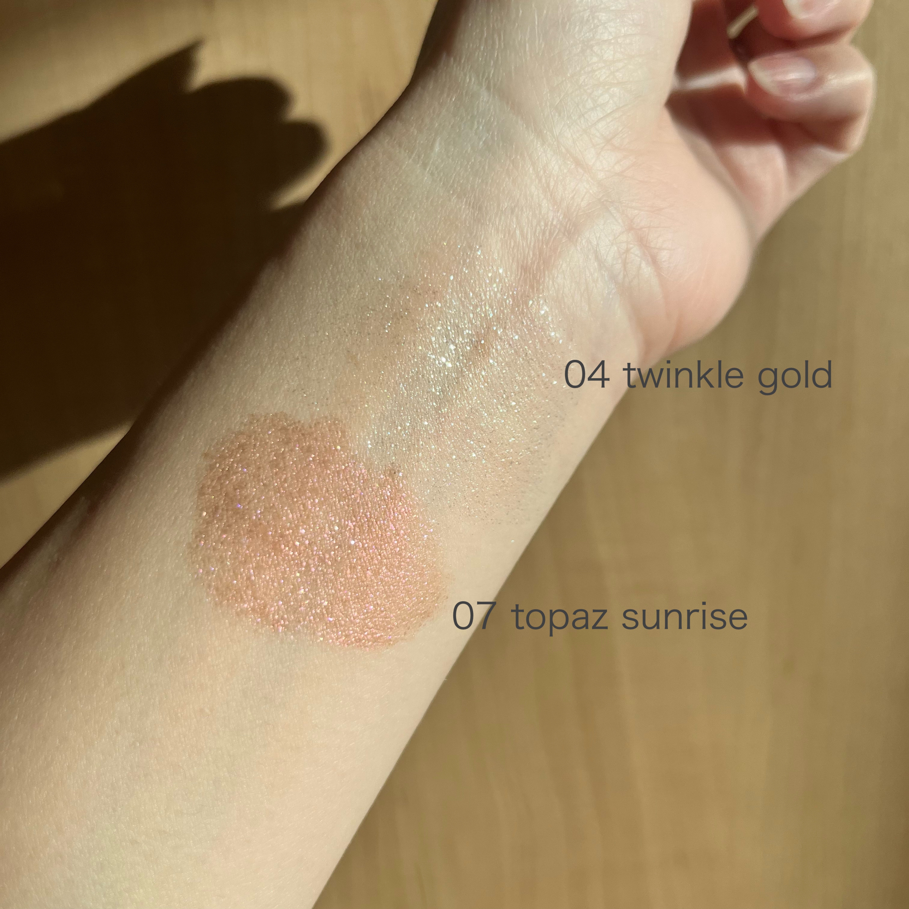 オレンジ系のパールで青っぽいラメが少し入っていて綺麗です。 パールラメが大きくてザクザクなので、少しでも多く付けると大変なことになるので、ちょっと使いにくいかなと思いました。 他のアイシャドウを塗る前の仕込みとして使うか、部分使いにした方が良さそうです。