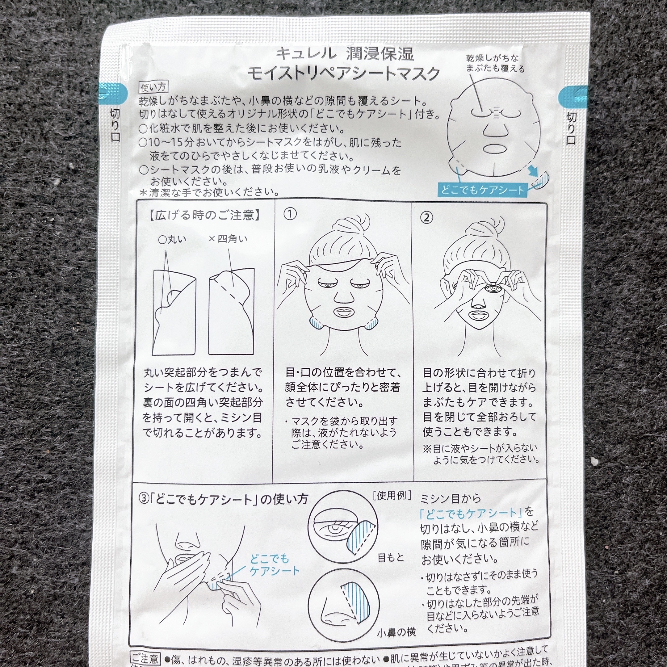 肌荒れを防ぐ消炎剤配合(有効成分) ✔️ セラミドの働きを補い、濃密な潤いをすみずみまで補給してくれるそう ✔️肌あたりやわらかなシートマスク 厚めのシートで肌あたりも良く、肌にピタッと密着してくれます。お肌が敏感な時でも優しい使い心地と、キメが整いもちっとする使用感がいいです。 マスクの下の部分は、切り離して小鼻等の隙間に貼れます。マスクのサイズによっては隙間ができるものもあるので、これも嬉しい。