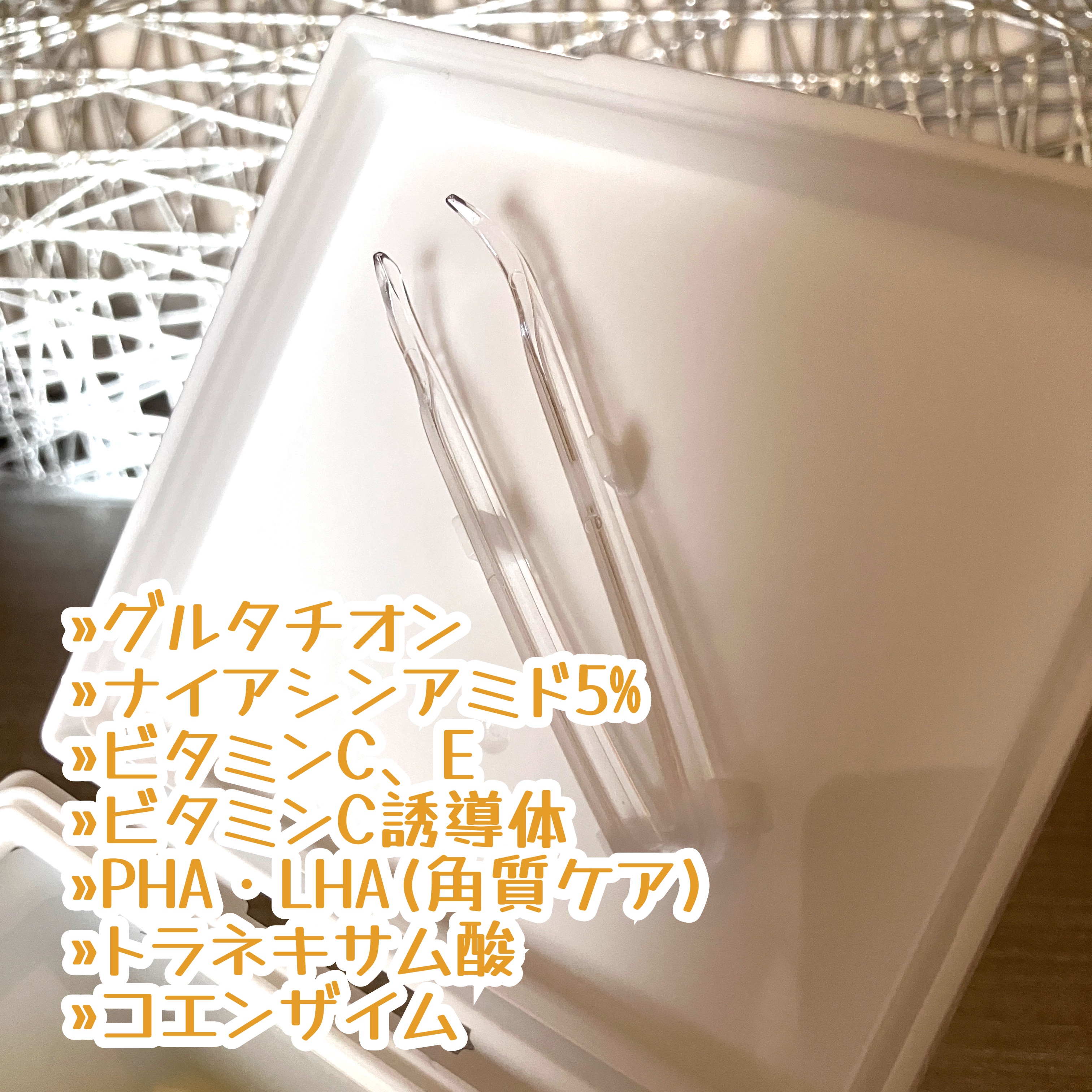 - <70枚> 水、ナイアシンアミド、DPG、グリセリン、プロパンジオール、BG、ヒドロキシエチルウレア、コハク酸ジエトキシエチル、ラウリン酸ポリグリセリル-10、ヒドロキシアセトフェノン、カプリリルグリコール、ベタイン、クエン酸、パンテノール、エチルヘキシルグリセリン、グルコノラクトン、ポリアクリル酸Na、(アクリロイルジメチルタウリンアンモニウム/VP)コポリマー、クエン酸Na、マルトデキストリン、1,2-ヘキサンジオール、クチナシエキス、グリチルリチン酸2K、ヒアルロン酸Na、アスコルビン酸、パントラクトン、トコフェロール、カプリロイルサリチル酸、シロキクラゲエキス、トリ(カプリル酸/カプリン酸)グリセリル、アスコルビルグルコシド、フェニルエチルレゾルシノール、ユビキノン、水添レシチン、塩化Mg、エタノール、グルタチオン、ポリソルベート80、グルコン酸Ca、ピリドキシンHCl、BHT、酵母エキス、シアノコバラミン、シリカ、EDTA-2Na