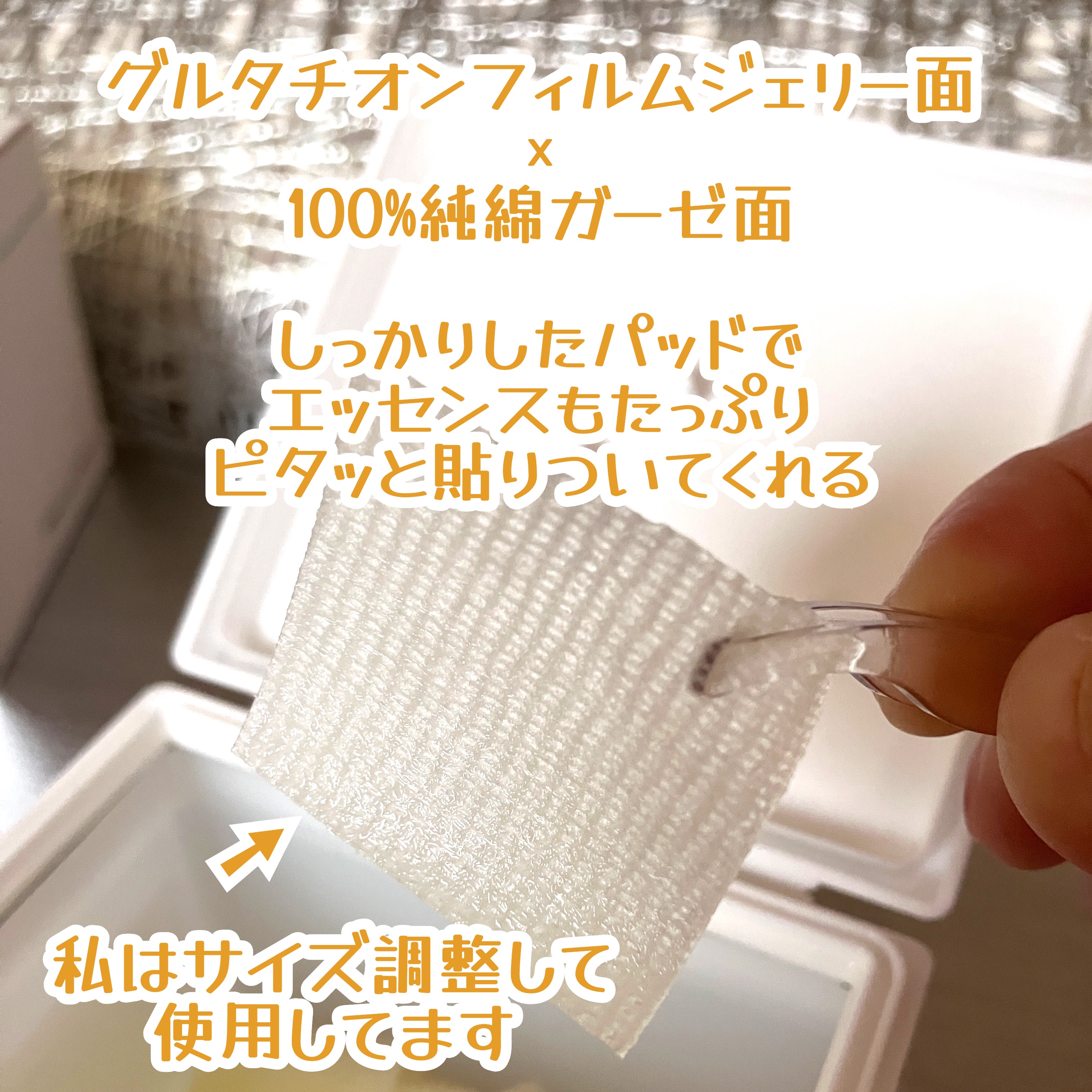 - ※初回限定品としておまけ付き商品を販売いたしますが、数量限定・在庫限りで終了とさせていただきます。尚、これにかかる商品の返品・交換は承っておりません。 グルタチオン*1とビタミン成分*1をそのままフィルム一枚に! 整肌フォーミュラを肌*2に浸透させ、透明感*3ケアにアプローチするフィルムパッド。 *1整肌成分 *2角質層まで *3潤いを与えることによる肌印象 <初回限定版> ゼリー面で貼るだけ簡単ケア。裏面のガーゼ面で角質ケアまで! 本品+ミニサンプル付き( 白玉グルタチオンC美容液7ml)