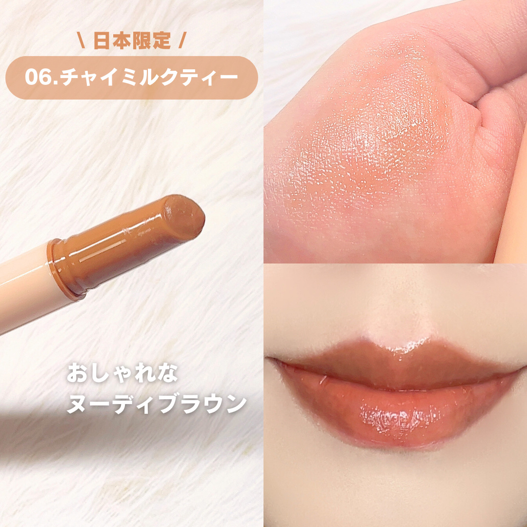 - <01 アプリコットティー> リンゴ酸ジイソステアリル、ダイマージリノール酸ダイマージリノレイルビス(ベヘニル/イソステアリル/フィトステリル)、ビスジグリセリルポリアシルアジペート-2、トリイソステアリン酸ポリグリセリル-2、水添ポリイソブテン、パラフィン、マイクロクリスタリンワックス、ウルシ果皮ロウ、ハチミツエキス、センチフォリアバラ花エキス、マンゴー果実エキス、カニナバラ果実エキス、アーモンド油、アルガニアスピノサ核油、アンズ核油、オリーブ果実油、シア脂、ツバキ種子油、ホホバ種子油、月見草油、BG、トリ(カプリル酸/カプリン酸)グリセリル、1,2-ヘキサンジオール、イソステアリン酸ソルビタン、酢酸トコフェロール、フェノキシエタノール、酸化鉄、酸化チタン、赤202、香料 <02 イチジクミルク> リンゴ酸ジイソステアリル、ダイマージリノール酸ダイマージリノレイルビス(ベヘニル/イソステアリル/フィトステリル)、ビスジグリセリルポリアシルアジペート-2、トリイソステアリン酸ポリグリセリル-2、水添ポリイソブテン、パラフィン、マイクロクリスタリンワックス、ウルシ果皮ロウ、ハチミツエキス、センチフォリアバラ花エキス、マンゴー果実エキス、カニナバラ果実エキス、アーモンド油、アルガニアスピノサ核油、シア脂、オリーブ果実油、アンズ核油、ツバキ種子油、ホホバ種子油、月見草油、BG、トリ(カプリル酸/カプリン酸)グリセリル、1,2-ヘキサンジオール、イソステアリン酸ソルビタン、酢酸トコフェロール、フェノキシエタノール、酸化鉄、酸化チタン、赤202、青1、香料 <03 ベリーヨーグルト> リンゴ酸ジイソステアリル、ダイマージリノール酸ダイマージリノレイルビス(ベヘニル/イソステアリル/フィトステリル)、ビスジグリセリルポリアシルアジペート-2、トリイソステアリン酸ポリグリセリル-2、水添ポリイソブテン、パラフィン、マイクロクリスタリンワックス、ウルシ果皮ロウ、ハチミツエキス、センチフォリアバラ花エキス、マンゴー果実エキス、カニナバラ果実エキス、アーモンド油、アルガニアスピノサ核油、シア脂、オリーブ果実油、アンズ核油、ツバキ種子油、ホホバ種子油、月見草油、BG、トリ(カプリル酸/カプリン酸)グリセリル、1,2-ヘキサンジオール、イソステアリン酸ソルビタン、酢酸トコフェロール、フェノキシエタノール、酸化鉄、酸化チタン、赤202、黄5、香料 <04 ザクロサワー> リンゴ酸ジイソステアリル、ダイマージリノール酸ダイマージリノレイルビス(ベヘニル/イソステアリル/フィトステリル)、ビスジグリセリルポリアシルアジペート-2、トリイソステアリン酸ポリグリセリル-2、水添ポリイソブテン、パラフィン、マイクロクリスタリンワックス、ウルシ果皮ロウ、ハチミツエキス、センチフォリアバラ花エキス、マンゴー果実エキス、カニナバラ果実エキス、アーモンド油、アルガニアスピノサ核油、シア脂、オリーブ果実油、アンズ核油、ツバキ種子油、ホホバ種子油、月見草油、BG、トリ(カプリル酸/カプリン酸)グリセリル、1,2-ヘキサンジオール、イソステアリン酸ソルビタン、酢酸トコフェロール、フェノキシエタノール、黄5、赤202、香料 <05 プラムワイン> リンゴ酸ジイソステアリル、ダイマージリノール酸ダイマージリノレイルビス(ベヘニル/イソステアリル/フィトステリル)、ビスジグリセリルポリアシルアジペート-2、トリイソステアリン酸ポリグリセリル-2、水添ポリイソブテン、パラフィン、マイクロクリスタリンワックス、ウルシ果皮ロウ、ハチミツエキス、センチフォリアバラ花エキス、マンゴー果実エキス、カニナバラ果実エキス、アーモンド油、アルガニアスピノサ核油、シア脂、オリーブ果実油、アンズ核油、ツバキ種子油、ホホバ種子油、月見草油、BG、トリ(カプリル酸/カプリン酸)グリセリル、1,2-ヘキサンジオール、イソステアリン酸ソルビタン、酢酸トコフェロール、フェノキシエタノール、酸化鉄、赤202、青1、香料 <06 チャイミルクティー> リンゴ酸ジイソステアリル、ダイマージリノール酸ダイマージリノレイルビス(ベヘニル/イソステアリル/フィトステリル)、ビスジグリセリルポリアシルアジペート-2、トリイソステアリン酸ポリグリセリル-2、水添ポリイソブテン、パラフィン、マイクロクリスタリンワックス、ハチミツエキス、センチフォリアバラ花エキス、マンゴー果実エキス、カニナバラ果実エキス、アーモンド油、アルガニアスピノサ核油、シア脂、オリーブ果実油、アンズ核油、ツバキ種子油、ホホバ種子油、月見草油、BG、トリ(カプリル酸/カプリン酸)グリセリル、水、1,2-ヘキサンジオール、イソステアリン酸ソルビタン、BHT、酢酸トコフェロール、フェノキシエタノール、酸化チタン、酸化鉄、香料 <21 ダーティチョコ> リンゴ酸ジイソステアリル、ダイマージリノール酸ダイマージリノレイルビス(ベヘニル/イソステアリル/フィトステリル)、ビスジグリセリルポリアシル