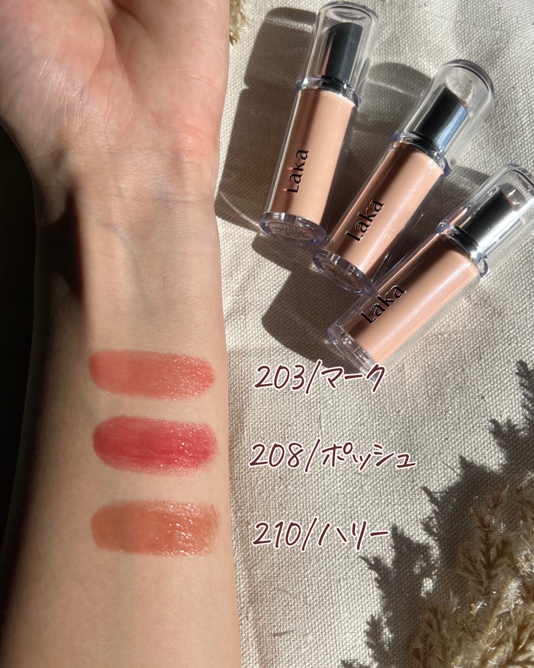 - Point1 透き通った気品が感じられるカラー ユニークなヌードカラーから自然なニュートラルカラー、深くて密度のあるポイントカラーまで、さまざまな好みに合わせた幅広いカラーバリエーション。それぞれのカラーが持つ明度や彩度に合わせて透明感を細かく調整しているため、グラデーションリップやオーバリップなど、プロが施したようなさまざまなリップメイクが楽しめます。また、夕方の暗い空間や、室内の光の下でも、唇本来の色にリップスティックのカラーが馴染み、水彩画のようなナチュラルな発色で、自然な血色感のある唇に演出します。 Point2 光に包まれたガラス玉のようなきらめき Lakaならではの「ボンディンググロウ」フォーミュラで、唇に触れた瞬間、体温でやさしく溶けていくようなテクスチャー。しっとりと馴染んで密着しながら唇をコーティングしてくれます。高い屈折率で光を強く反射させるハイシャインオイルコンプレックスを配合し、光沢感のある生き生きとしたリップカラーを実現しました。