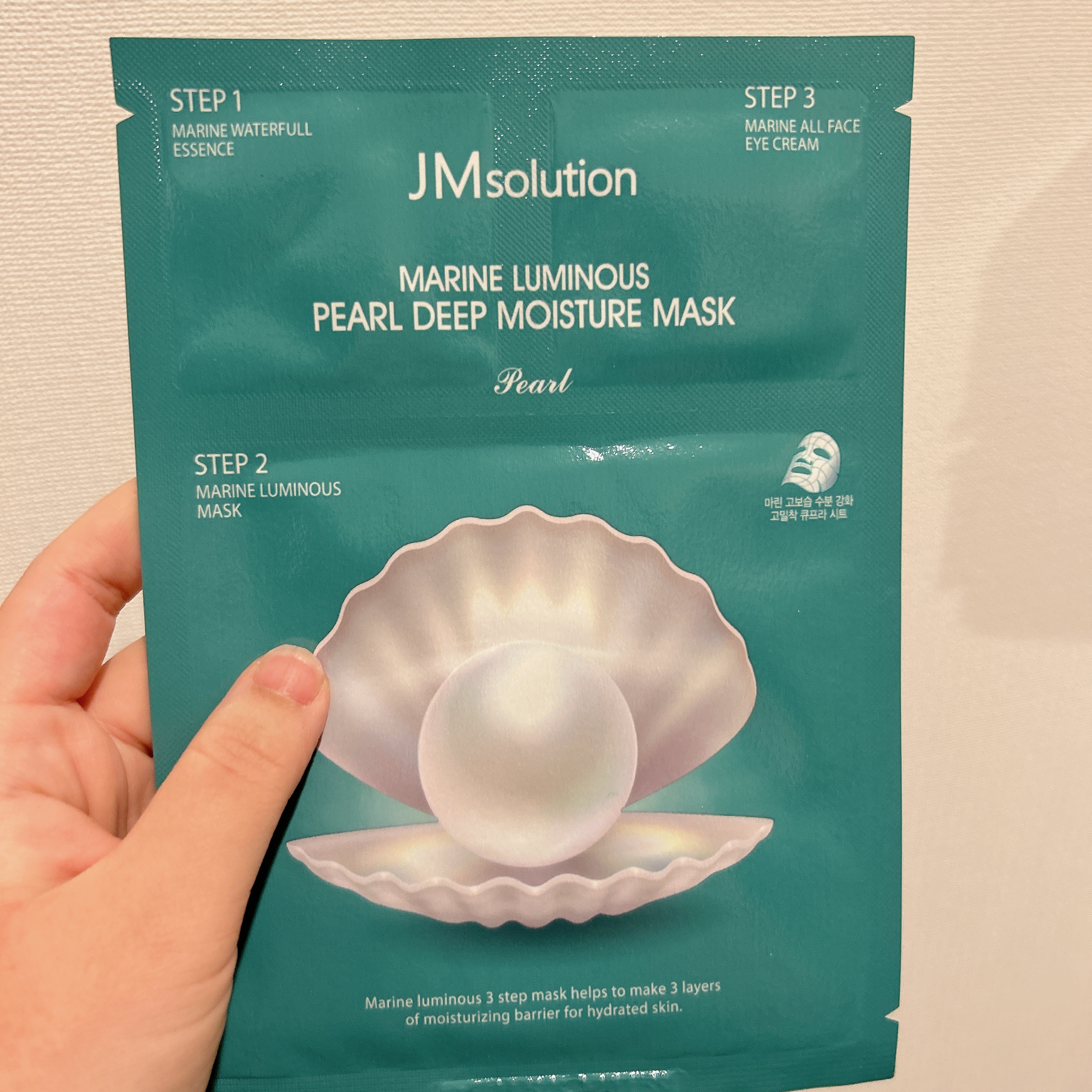 JM solutionの Marine luminous pearl deep moisture mask。もらった時は普通のマスクだと思ってたけどよく見てみたら3ステップが1枚になったマスクだった〜! ステップ2 シートマスク 密着が良い! けど目の穴が大きすぎて私のケアしたい目尻あたり、は保湿ケアのカバーできず。 お肌は朝まで調子が良かったのでお泊まりに持って行くとき用にいくつかストックしておきたいなと思いました!