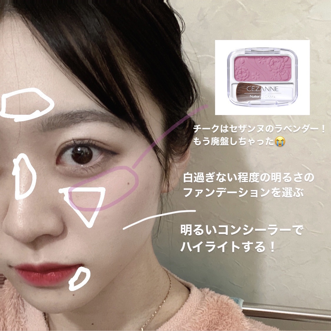 涙袋というものは立体的なものなので全体に明るいコンシーラーを塗ってしまうと不自然になってしまいます。 ピンクの部分にのみ明るいコンシーラーを塗ります🙆 この色が最高に自然にぷっくり仕上がる!!!