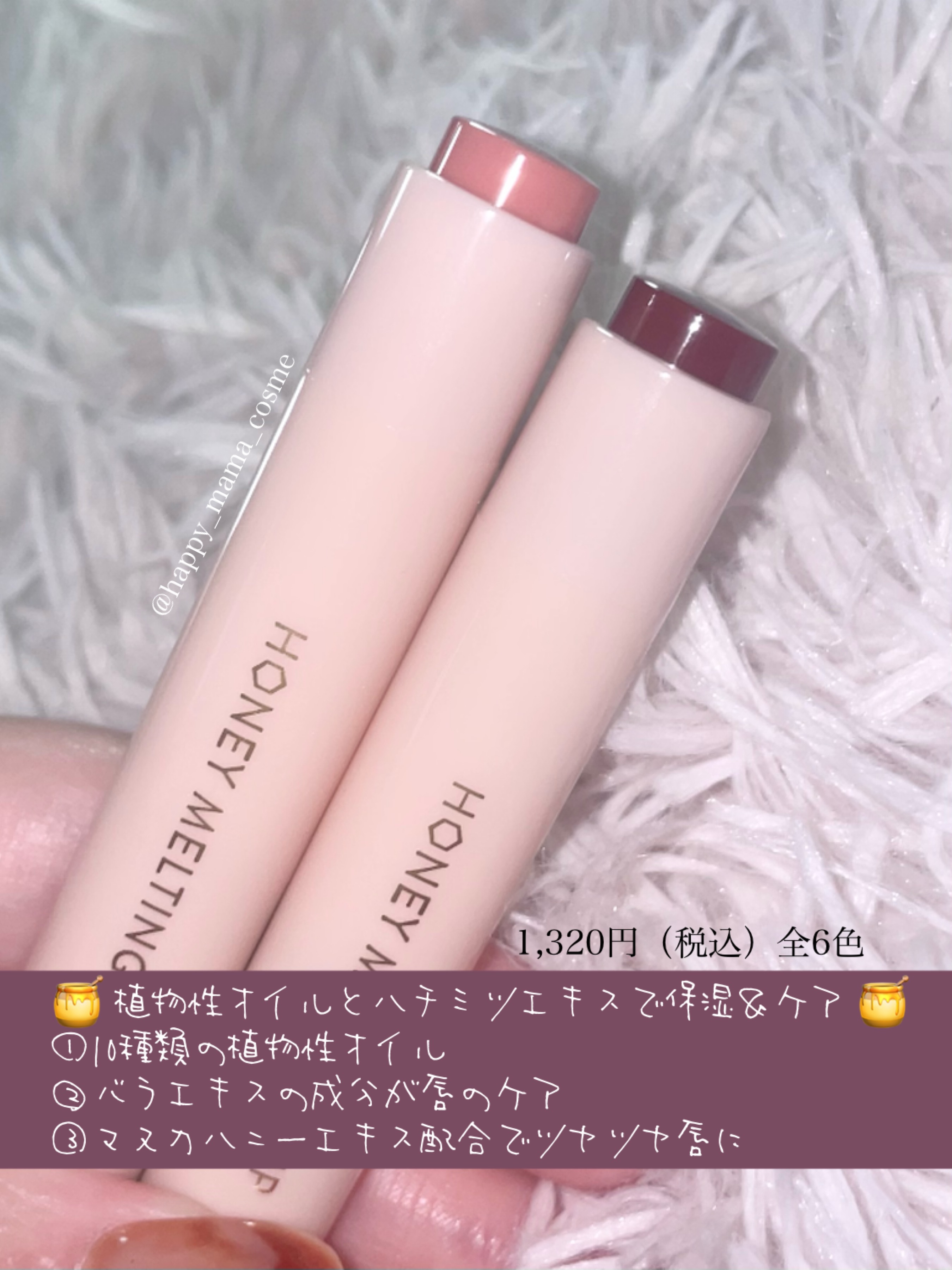 - 韓国では実店舗、オンラインともに完売が続出し、なかなか手に入らないと話題になっている「ハニーメルティングリップ」。 ルージュのように発色し、リッププランパーをつけたかのようなボリューム感を出すことができるリップです。 ハチミツエキス、バラエキス(*)、8種の天然由来オイル(*1)が配合されており、リップオイル効果で韓国アイドル風のあどけない唇を演出できます。 高発色なのにとろける“むっちり唇” 3in1〚ルージュ/高発色〛〚むっちりプランパー/立体感〛〚リップオイル/高保湿〛いいトコ取りの欲張りリップで韓国アイドル風のあどけないぷるぷるリップに演出! *センチフォリアバラ花エキス *1.アーモンド油、アルガニアスピノサ核油、アンズ核油、オリーブ果実油、シア脂、ツバキ種子油、ホホバ種子油、月見草油 (*ー*1.全て保湿成分) 2023年11⽉13⽇(月):ネイチャーリパブリック公式サイト 12月8日(金):全国のバラエティショップ、マツモトキヨシグループ、ココカラファイングループ、ドン・キホーテにて順次発売