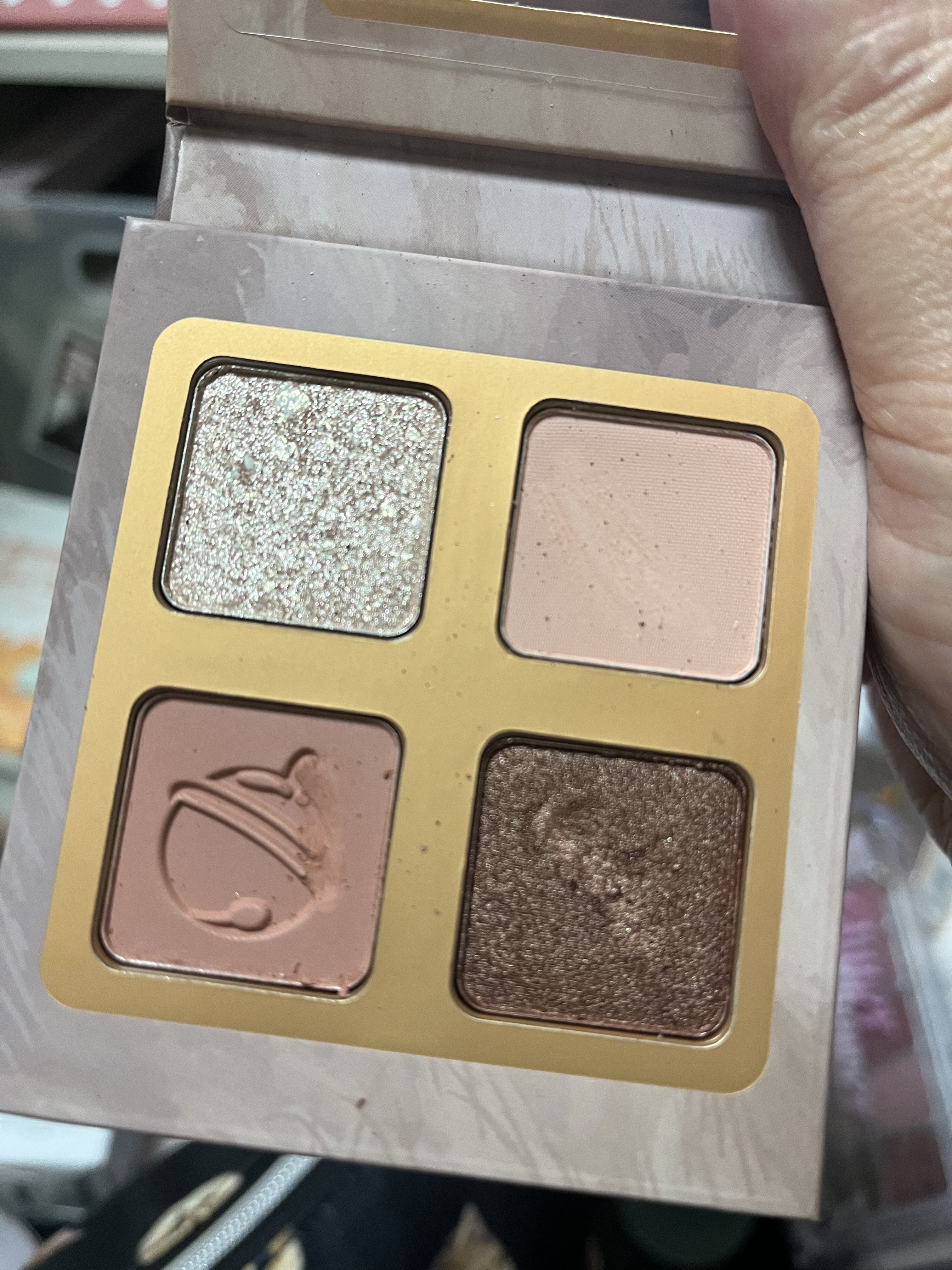 可愛い4色アイシャドウ✨ 落として②がひび割れました😂 見た目が③は黒にラメのシャドウかと思っていたのですが 塗って肌にのせると赤っぽい、ピンク紫?っぽい感じの色でした❣️ ポイントで涙袋キラキラするので涙袋に使用しても可愛い感じでした💕