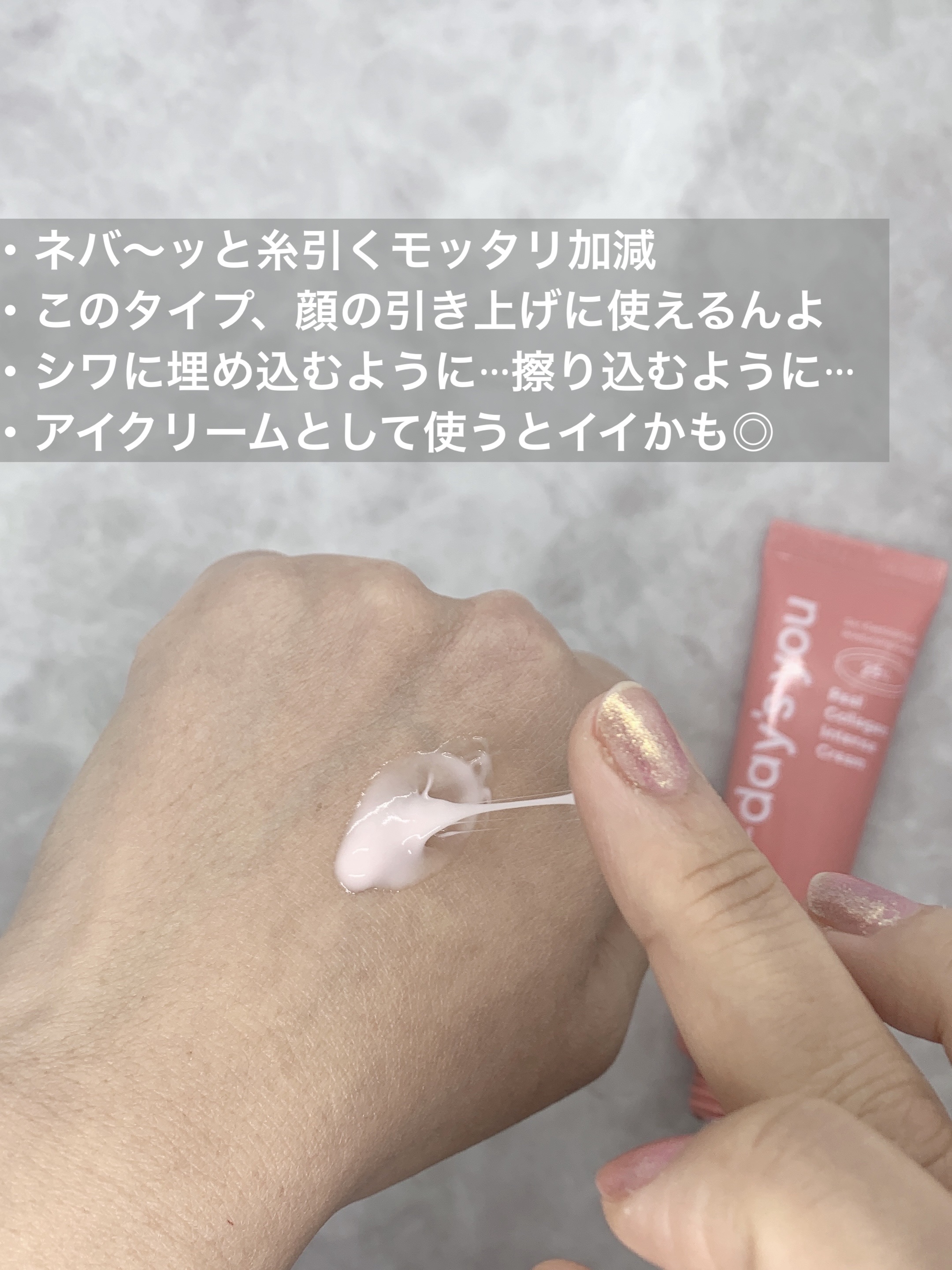 乾燥やハリなどの集中ケアにおすすめのクリームです。 先が細くなってて必要な量を出すことができます! 何よりこの体験したことのないテクスチャーが面白い。糸引くネバネバテクスチャーです♪ 使った後はしっとりだけどベタつかずです!