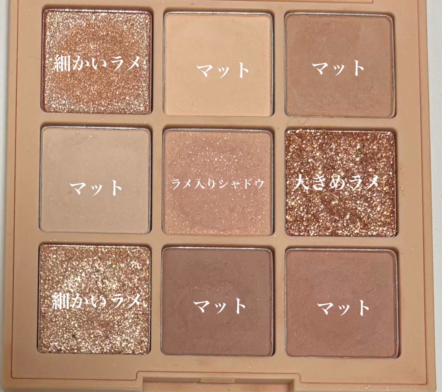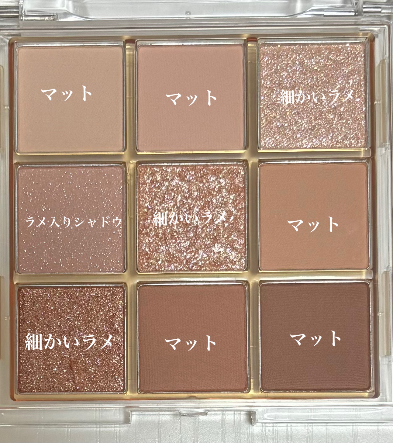 その日の雰囲気によって多彩に活用できる 9色のアイシャドウパレット✨ ミルククッキーのような柔らかいカラーを詰め込んだ、ソフトブラウン陰影カラーシャドウです。 肌なじみの良いカラーがセットされているのでどの肌トーンにも◎ ラメカラーもギラギラせず繊細でキレイです。
