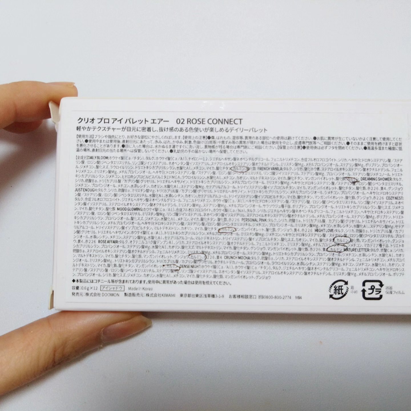 - <101 ローズダイアリー(ROSE DIARY)> ●ロマンティック ベース タルク、オクテニルコハク酸デンプンAl、シリカ、トリ(カプリル酸/カプリン酸)グリセリル、トリエチルヘキサノイン、ホウケイ酸(Ca/Al)、トリエトキシカプリリルシラン、ミリスチン酸Mg、メチルプロパンジオール、ジメチコン、マカデミア種子油、ヘキサ(ヒドロキシステアリン酸/ステアリン酸/ロジン酸)ジペンタエリスリチル、ステアリン酸Mg、プロパンジオール、水酸化Al、カオリン、酸化スズ、マイカ、酸化チタン、マンガンバイオレット、酸化鉄、グンジョウ ●トゥインクル チャーム ホウケイ酸(Ca/Al)、ホウケイ酸(Ca/チタン)、ホウケイ酸(Ca/Na)、リンゴ酸ジイソステアリル、炭酸Ca、トリ(カプリル酸/カプリン酸)グリセリル、窒化ホウ素、合成フルオロフロゴパイト、ジフェニルシロキシフェニルトリメチコン、ステアロイルオキシステアリン酸オクチルドデシル、ステアリン酸亜鉛、イソステアリン酸水添ヒマシ油、シリカ、水添ポリイソブテン、ミリスチン酸Mg、ステアリン酸Mg、ヘキサ(ヒドロキシステアリン酸/ステアリン酸/ロジン酸)ジペンタエリスリチル、 メチルプロパンジオール、ダイマージリノール酸(フィトステリル/イソステアリル/セチル/ステアリル/ベヘニル)、ポリプロピレン、アルキル(C30-45)ジメチコン、プロパンジオール、酸化スズ、トリエトキシカプリリルシラン、ジステアルジモニウムヘクトライト、セルロース、炭酸プロピレン、マルトデキストリン、マイカ、酸化チタン、オキシ塩化ビスマス、酸化鉄、カルミン、グンジョウ ●ブラッシュ ウィッシュ ホウケイ酸(Ca/Al)、合成フルオロフロゴパイト、タルク、ホウケイ酸(Ca/Na)、ジエチルヘキサン酸ネオペンチルグリコール、シリカ、フェニルトリメチコン、ヘキサ(ヒドロキシステアリン酸/ステアリン酸/ロジン酸)ジペンタエリスリチル、ミリスチン酸Mg、リンゴ酸ジイソステアリル、ネオペンタン酸イソステアリル、ステアロイルオキシステアリン酸オクチルドデシル、ステアリン酸Mg、メチルプロパンジオール、トリエトキシカプリリルシラン、ポリブテン、プロパンジオール、酸化スズ、ジメチコン、 水酸化Al、メチコン、マルトデキストリン、酸化チタン、マイカ、酸化鉄、カルミン ●ローズ パンチ タルク、オクテニルコハク酸デンプンAl、シリカ、硫酸Ba、トリ(カプリル酸/カプリン酸)グリセリル、リンゴ酸ジイソステアリル、ホウケイ酸(Ca/Al)、ミリスチン酸Mg、メチルプロパンジオール、ジメチコン、マカデミア種子油、ステアリン酸Mg、プロパンジオール、水添レシチン、トリエトキシカプリリルシラン、水酸化Al、メチコン、マルトデキストリン、カオリン、酸化スズ、マイカ、酸化チタン、カルミン、マンガンバイオレット、酸化鉄、グンジョウ、黄4 ●ワイン ファンタジー タルク、シリカ、ホウケイ酸(Ca/Al)、窒化ホウ素、ステアロイルオキシステアリン酸オクチルドデシル、フェニルトリメチコン、メチルプロパンジオール、オクチルドデカノール、(HDI/トリメチロールヘキシルラクトン)クロスポリマー、マカデミア種子油、ミリスチン酸Mg、ジメチコン、カオリン、ヘキサ(ヒドロキシステアリン酸/ステアリン酸/ロジン酸)ジペンタエリスリチル、プロパンジオール、リンゴ酸ジイソステアリル、ステアリン酸Mg、トリエトキシカプリリルシラン、 ステアリン酸ジメチコノール、水酸化Al、酸化スズ、メチコン、マルトデキストリン、マイカ、マンガンバイオレット、グンジョウ、酸化チタン、酸化鉄、カルミン ●ベリー シナモン タルク、合成フルオロフロゴパイト、トリエチルヘキサノイン、トリイソステアリン酸ポリグリセリル-2、シリカ、イソステアリン酸水添ヒマシ油、ミリスチン酸Mg、メチルプロパンジオール、ナイロン-12、プロパンジオール、ジメチコン、カオリン、ラウロイルリシン、アルミナ、トリエトキシカプリリルシラン、酸化スズ、水酸化Al、マイカ、酸化鉄、マンガンバイオレット、酸化チタン ●シークレット レモン タルク、ホウケイ酸(Ca/Al)、シリカ、トリエチルヘキサノイン、トリイソステアリン酸ポリグリセリル-2、ミリスチン酸Mg、ステアリン酸Mg、イソステアリン酸水添ヒマシ油、メチルプロパンジオール、プロパンジオール、酸化スズ、マイカ、酸化チタン ●スウィート シャンデリア タルク、合成フルオロフロゴパイト、パルミチン酸エチルヘキシル、ホウケイ酸(Ca/チタン)、リンゴ酸ジイソステアリル、シリカ、ジメチコン、ミリスチン酸Mg、メチルプロパンジオール、ステアリン酸Mg、プロパンジオール、ステアリン酸ジメチコノール、マカデミア種子油、トリエトキシカプリリルシラン、水添レシチン、酸化スズ、水酸化Al、メチコン、マイカ、酸化チタン、酸化鉄、カルミン ●バニラ ベベ タルク、パルミチン酸エチルヘキシル、ホウケイ酸(Ca/チタン)、リンゴ酸ジイソステアリル、ジメチコン、ミリスチン酸Mg、シリカ、ステアリ