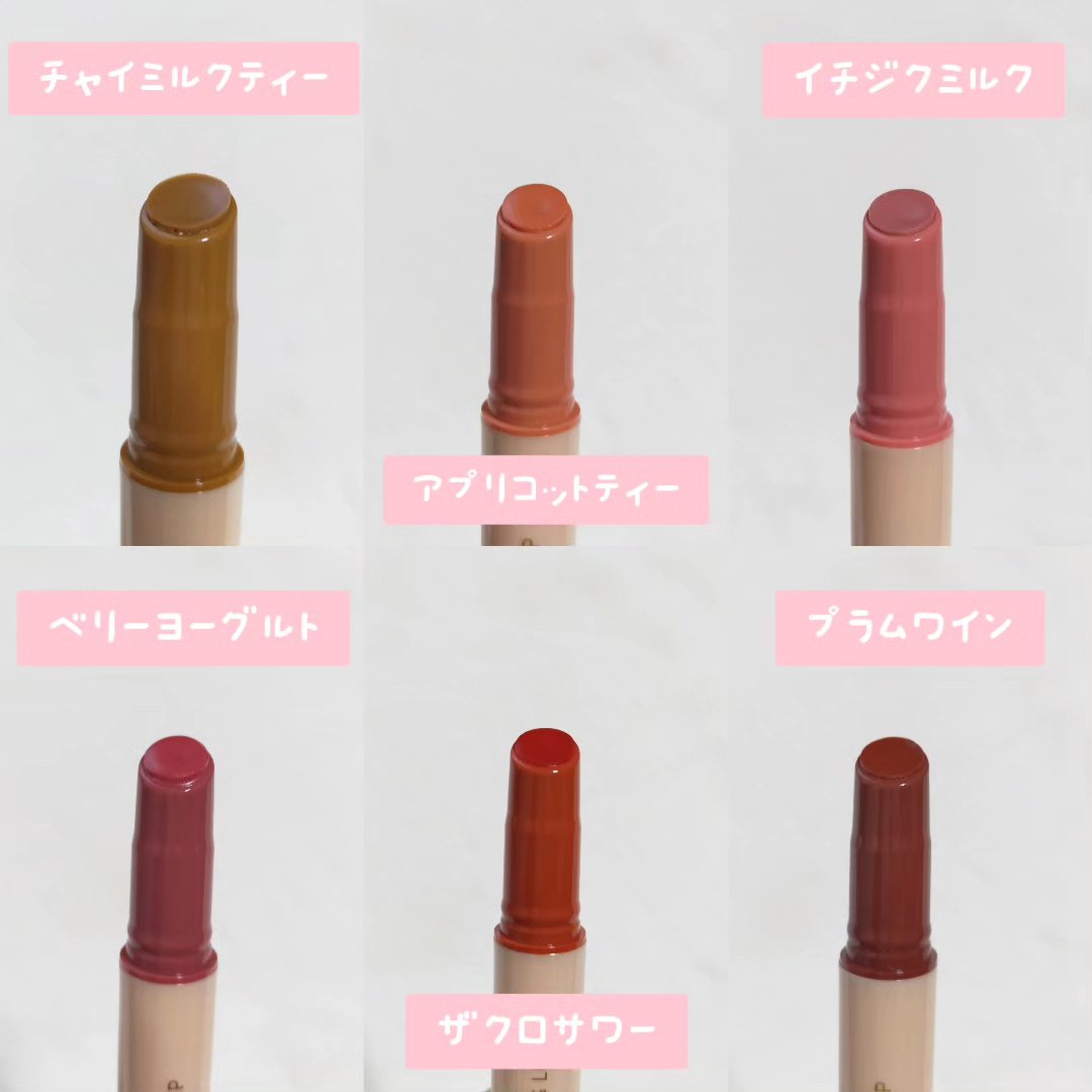 - <01 アプリコットティー> リンゴ酸ジイソステアリル、ダイマージリノール酸ダイマージリノレイルビス(ベヘニル/イソステアリル/フィトステリル)、ビスジグリセリルポリアシルアジペート-2、トリイソステアリン酸ポリグリセリル-2、水添ポリイソブテン、パラフィン、マイクロクリスタリンワックス、ウルシ果皮ロウ、ハチミツエキス、センチフォリアバラ花エキス、マンゴー果実エキス、カニナバラ果実エキス、アーモンド油、アルガニアスピノサ核油、アンズ核油、オリーブ果実油、シア脂、ツバキ種子油、ホホバ種子油、月見草油、BG、トリ(カプリル酸/カプリン酸)グリセリル、1,2-ヘキサンジオール、イソステアリン酸ソルビタン、酢酸トコフェロール、フェノキシエタノール、酸化鉄、酸化チタン、赤202、香料 <02 イチジクミルク> リンゴ酸ジイソステアリル、ダイマージリノール酸ダイマージリノレイルビス(ベヘニル/イソステアリル/フィトステリル)、ビスジグリセリルポリアシルアジペート-2、トリイソステアリン酸ポリグリセリル-2、水添ポリイソブテン、パラフィン、マイクロクリスタリンワックス、ウルシ果皮ロウ、ハチミツエキス、センチフォリアバラ花エキス、マンゴー果実エキス、カニナバラ果実エキス、アーモンド油、アルガニアスピノサ核油、シア脂、オリーブ果実油、アンズ核油、ツバキ種子油、ホホバ種子油、月見草油、BG、トリ(カプリル酸/カプリン酸)グリセリル、1,2-ヘキサンジオール、イソステアリン酸ソルビタン、酢酸トコフェロール、フェノキシエタノール、酸化鉄、酸化チタン、赤202、青1、香料 <03 ベリーヨーグルト> リンゴ酸ジイソステアリル、ダイマージリノール酸ダイマージリノレイルビス(ベヘニル/イソステアリル/フィトステリル)、ビスジグリセリルポリアシルアジペート-2、トリイソステアリン酸ポリグリセリル-2、水添ポリイソブテン、パラフィン、マイクロクリスタリンワックス、ウルシ果皮ロウ、ハチミツエキス、センチフォリアバラ花エキス、マンゴー果実エキス、カニナバラ果実エキス、アーモンド油、アルガニアスピノサ核油、シア脂、オリーブ果実油、アンズ核油、ツバキ種子油、ホホバ種子油、月見草油、BG、トリ(カプリル酸/カプリン酸)グリセリル、1,2-ヘキサンジオール、イソステアリン酸ソルビタン、酢酸トコフェロール、フェノキシエタノール、酸化鉄、酸化チタン、赤202、黄5、香料 <04 ザクロサワー> リンゴ酸ジイソステアリル、ダイマージリノール酸ダイマージリノレイルビス(ベヘニル/イソステアリル/フィトステリル)、ビスジグリセリルポリアシルアジペート-2、トリイソステアリン酸ポリグリセリル-2、水添ポリイソブテン、パラフィン、マイクロクリスタリンワックス、ウルシ果皮ロウ、ハチミツエキス、センチフォリアバラ花エキス、マンゴー果実エキス、カニナバラ果実エキス、アーモンド油、アルガニアスピノサ核油、シア脂、オリーブ果実油、アンズ核油、ツバキ種子油、ホホバ種子油、月見草油、BG、トリ(カプリル酸/カプリン酸)グリセリル、1,2-ヘキサンジオール、イソステアリン酸ソルビタン、酢酸トコフェロール、フェノキシエタノール、黄5、赤202、香料 <05 プラムワイン> リンゴ酸ジイソステアリル、ダイマージリノール酸ダイマージリノレイルビス(ベヘニル/イソステアリル/フィトステリル)、ビスジグリセリルポリアシルアジペート-2、トリイソステアリン酸ポリグリセリル-2、水添ポリイソブテン、パラフィン、マイクロクリスタリンワックス、ウルシ果皮ロウ、ハチミツエキス、センチフォリアバラ花エキス、マンゴー果実エキス、カニナバラ果実エキス、アーモンド油、アルガニアスピノサ核油、シア脂、オリーブ果実油、アンズ核油、ツバキ種子油、ホホバ種子油、月見草油、BG、トリ(カプリル酸/カプリン酸)グリセリル、1,2-ヘキサンジオール、イソステアリン酸ソルビタン、酢酸トコフェロール、フェノキシエタノール、酸化鉄、赤202、青1、香料 <06 チャイミルクティー> リンゴ酸ジイソステアリル、ダイマージリノール酸ダイマージリノレイルビス(ベヘニル/イソステアリル/フィトステリル)、ビスジグリセリルポリアシルアジペート-2、トリイソステアリン酸ポリグリセリル-2、水添ポリイソブテン、パラフィン、マイクロクリスタリンワックス、ハチミツエキス、センチフォリアバラ花エキス、マンゴー果実エキス、カニナバラ果実エキス、アーモンド油、アルガニアスピノサ核油、シア脂、オリーブ果実油、アンズ核油、ツバキ種子油、ホホバ種子油、月見草油、BG、トリ(カプリル酸/カプリン酸)グリセリル、水、1,2-ヘキサンジオール、イソステアリン酸ソルビタン、BHT、酢酸トコフェロール、フェノキシエタノール、酸化チタン、酸化鉄、香料 <21 ダーティチョコ> リンゴ酸ジイソステアリル、ダイマージリノール酸ダイマージリノレイルビス(ベヘニル/イソステアリル/フィトステリル)、ビスジグリセリルポリアシル