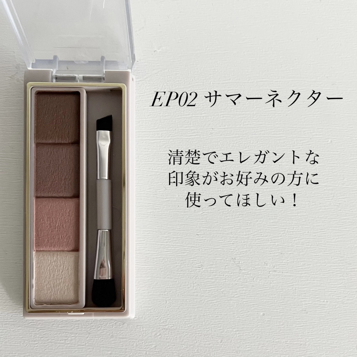 - <EP01 スプリングモカ><EP02 サマーネクター> <EP03 オータムベージュ><EP04 ウィンターモーヴ> タルク、ジメチコン、合成フルオロフロゴパイト、シリカ、リンゴ酸ジイソステアリル、合成モクロウ、パンテノール、スクワラン、トコフェロール、フェノキシエタノール、グンジョウ、ステアリン酸Mg、マイカ、酸化チタン、酸化鉄、水酸化Al