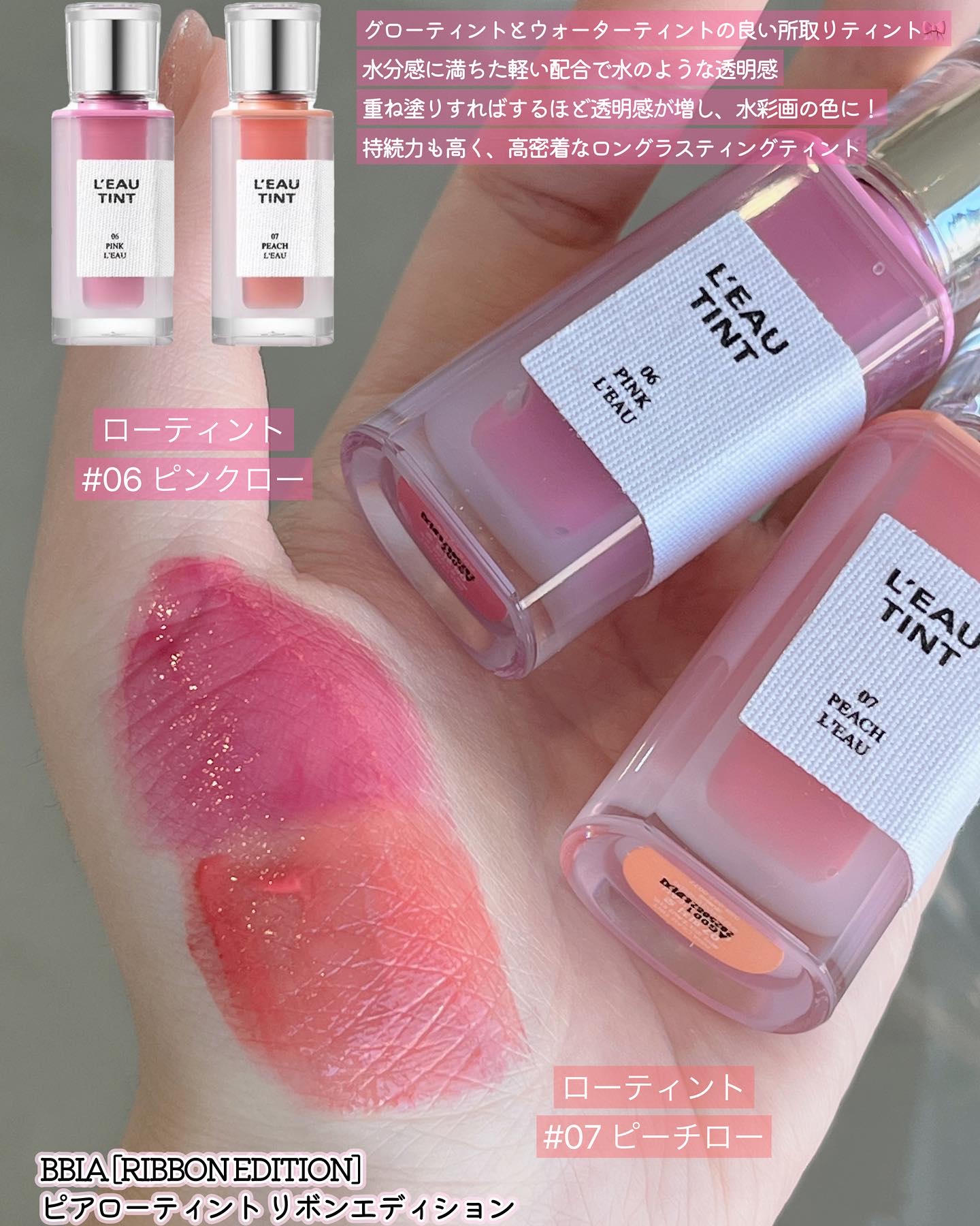 - - うるおいリップなのにしっかりカラーが定着し、時間が経っても塗りたてそのままのカラーを維持 *色が落ちにくいことから「飲み会リップ」としてSNSで話題に - 水のように軽くて快適なグロウティント、塗り重ねるほど鮮やかで透明に浮き上がる水彩画カラー - 香水瓶をイメージしたBBIA初のカスタムデザイン。パッケージはもちろん、カラーとテクスチャーに真心を込めて開発
