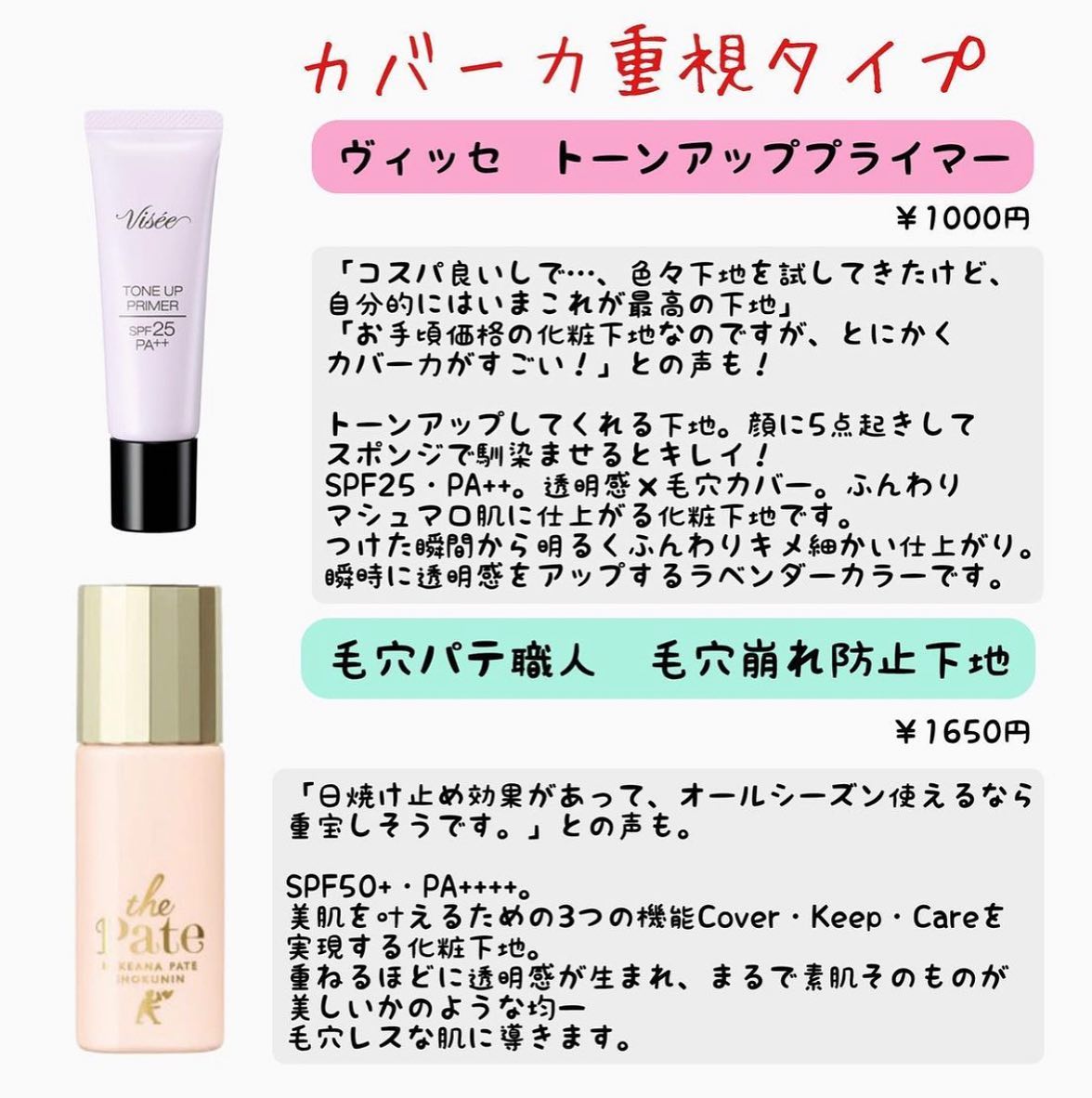 圧倒的に1番使ってる下地です! 程よいカバー力で肌を均一にしてくれるので、これとコンシーラーで完成させる時もあります。UVカット効果もあり夏場も使いやすい◎ こちらカバー力はほとんど無いですが、ラロッシュポゼより崩れにくい気がします。色も付かないのでメイクの邪魔にならない◎ これはとにかく皮脂テカリを防止したい時用です。個人的にはプチプラの中でも圧倒的にテカりと崩れに強いと思います!