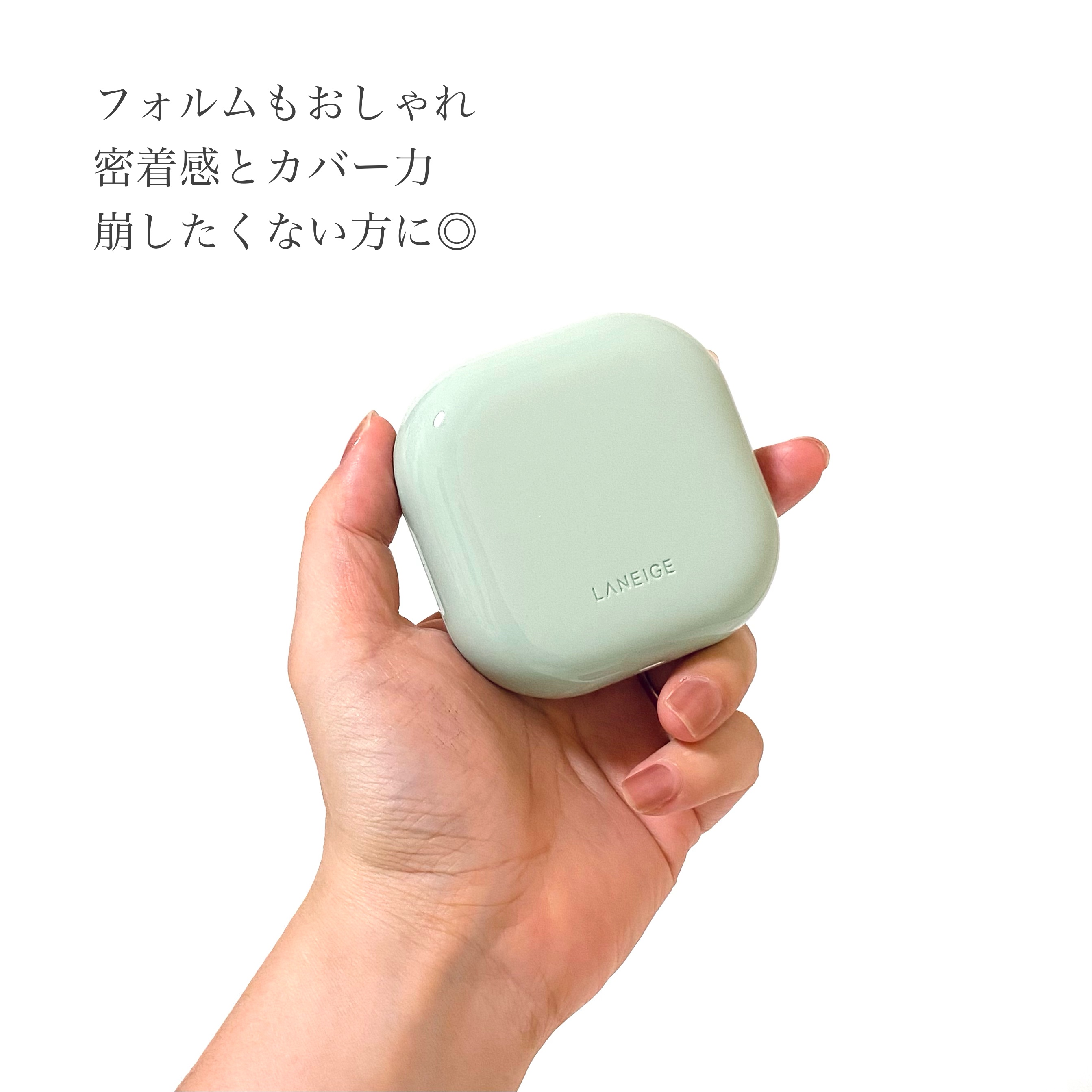 - 肌にぴたっと密着することで、24時間*¹崩れにくい ナチュラルマット肌に仕上げる世界中で大人気のクッションファンデーション *¹当社調べ、個人差があります。 1.VIVID COVERAGE ™(ヴィヴィッドカバレッジ) 技術を採用 LANEIGEクッション史上最も小さいパウダーが、 しっかりカバーなのに重くなく、軽い付け心地とナチュラルな仕上がりを実現しました。 塗りなおしても厚塗り感がなく、カラーメイクをさらにひきたてます。 2.高い密着力を実現したStrong Fixing Formula™ (ストロングフィクシングフォーミュラー )技術を採用し、 皮脂や汗に強くマスクやスマートフォンにも ファンデーションがつきにくい肌に仕上げます 3.皮脂コントロールパウダー配合で汗や皮脂による崩れを防ぎ、 肌のうるおいを閉じ込め乾燥しずらい、ナチュラルなセミマット肌を実現します。 4.アモーレパシフィック初のブルーライトカット効果採用のクッション スマフォやPCといった電子機器、LEDや蛍光灯から発せられるあらゆるブルーライトから肌をプロテクトします。