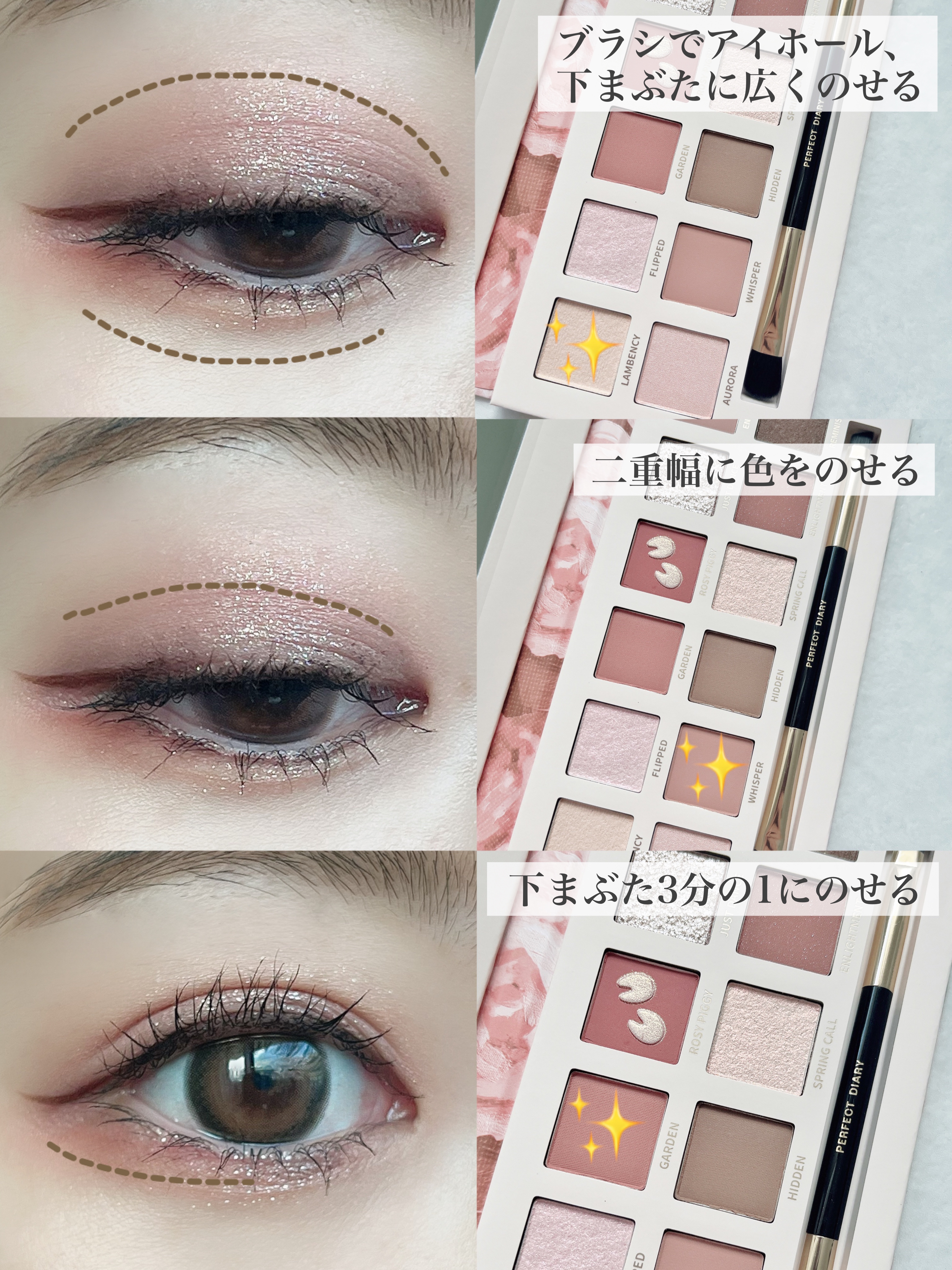 ブラシに一回アイシャドウをとったら 目のキワから上に向かってジグザグに塗るだけ! たっぷり粉が付いているときは目のキワで 何往復かさせて、あとは残った粉で アイホールへなじませるようにジグザグに どんなアイシャドウでも使えるテクなので ぜひ参考にしてみてね\♡