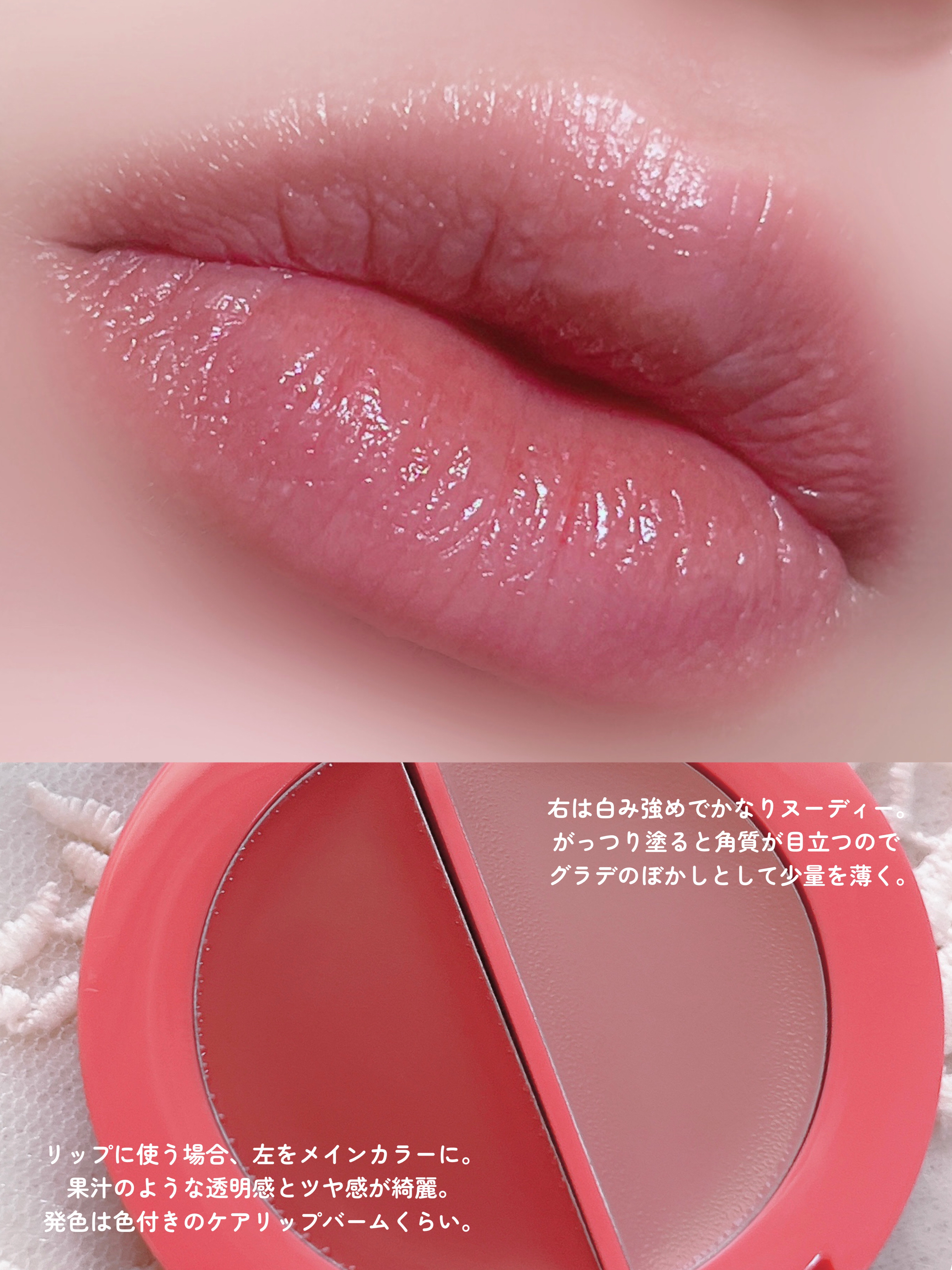 - みずみずしく爽やかな生果実の果汁にダイブ! フレッシュな果実にインスピレーションを受け誕生した みずみずしく爽やかな生果汁ツヤを完成させる リップ&チークヘルシーバーム フィトコラーゲン, モモセラミド配合 70%エッセンスのクリーム&バーム 2つにカラーが透けぷるんと重ね合い 血色感とツヤ感MAX!