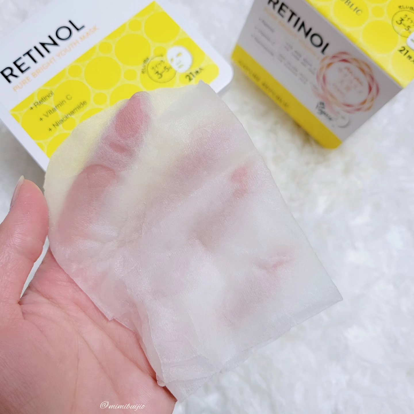 レチノール*をメイン成分とし、9種類のビタミン(*1)を配合した「レチノール* ピュアブライトユースシートマスク」。 マイルドでさっぱりした使い心地がまだまだ蒸し暑いこの季節にぴったり! 薄いシートで密着してくれる感じでとても好きな感じ◎