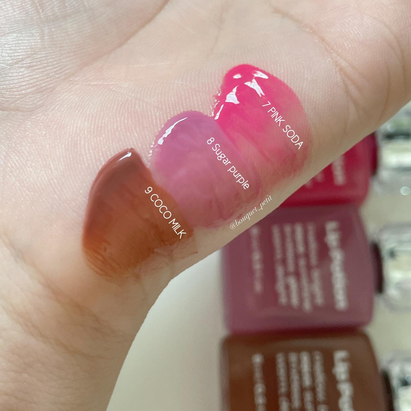 ウォータリーなテクスチャーで、ツヤップリッな、みずみずしい唇に💋 3〜6は誰でも比較的使いやすいカラーだと思う✨ 7〜9は挑戦という意味で購入してみた!✊ 因みに、パッケージ箱も拘ってて、開封するとイラストが出てくるんです…素敵すぎる💓