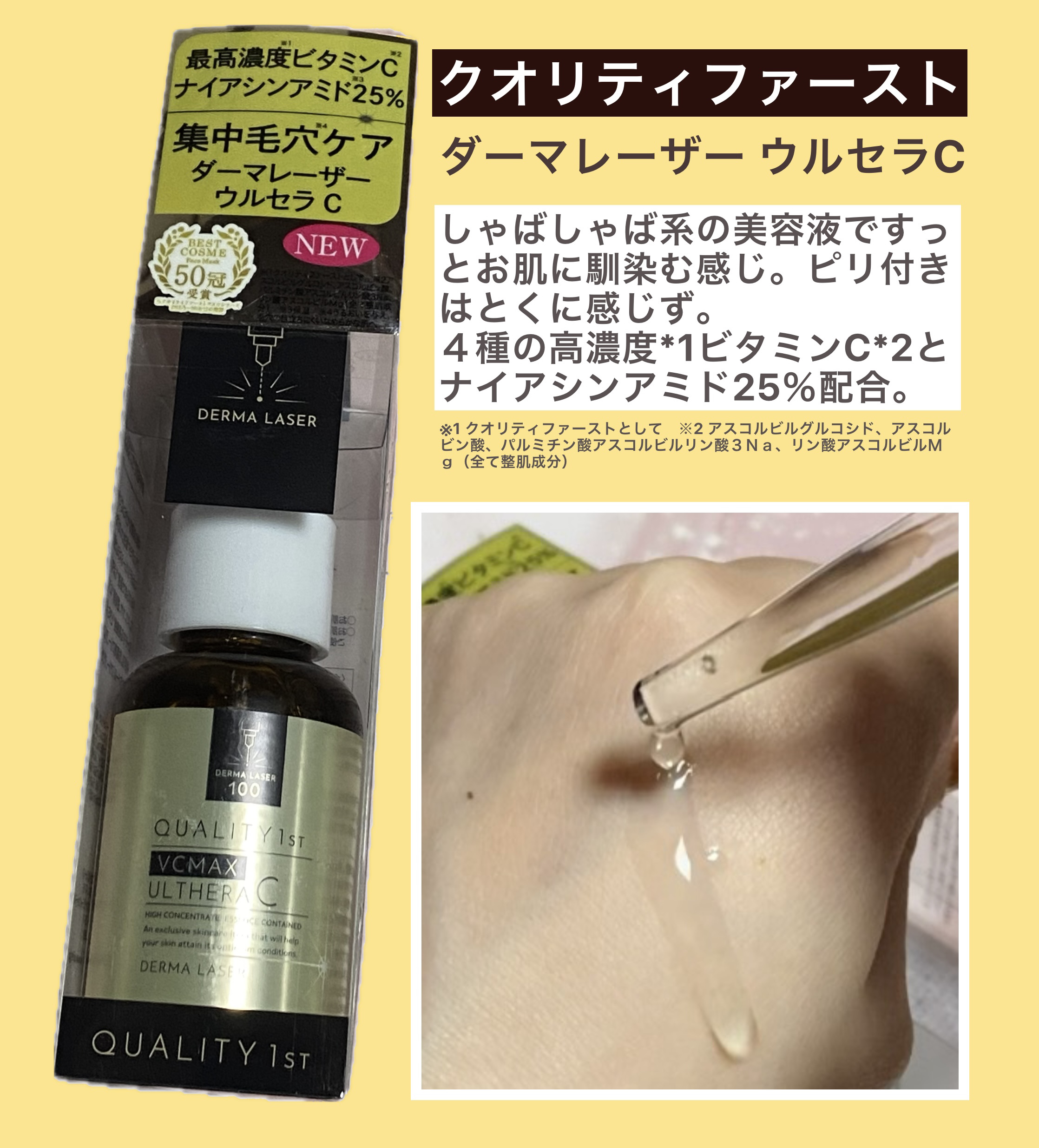 Plazaで買った美容液🍁クオリティファーストダーマレーザーウルセラCシリーズ最高峰※1の毛穴ケア美容液4種の高濃度※1ビタミンC※2とナイアシンアミド25%配合。それらを酵母エキス(ガラクトミセス培養液)に溶かし込み、全方位の毛穴悩みに対応...