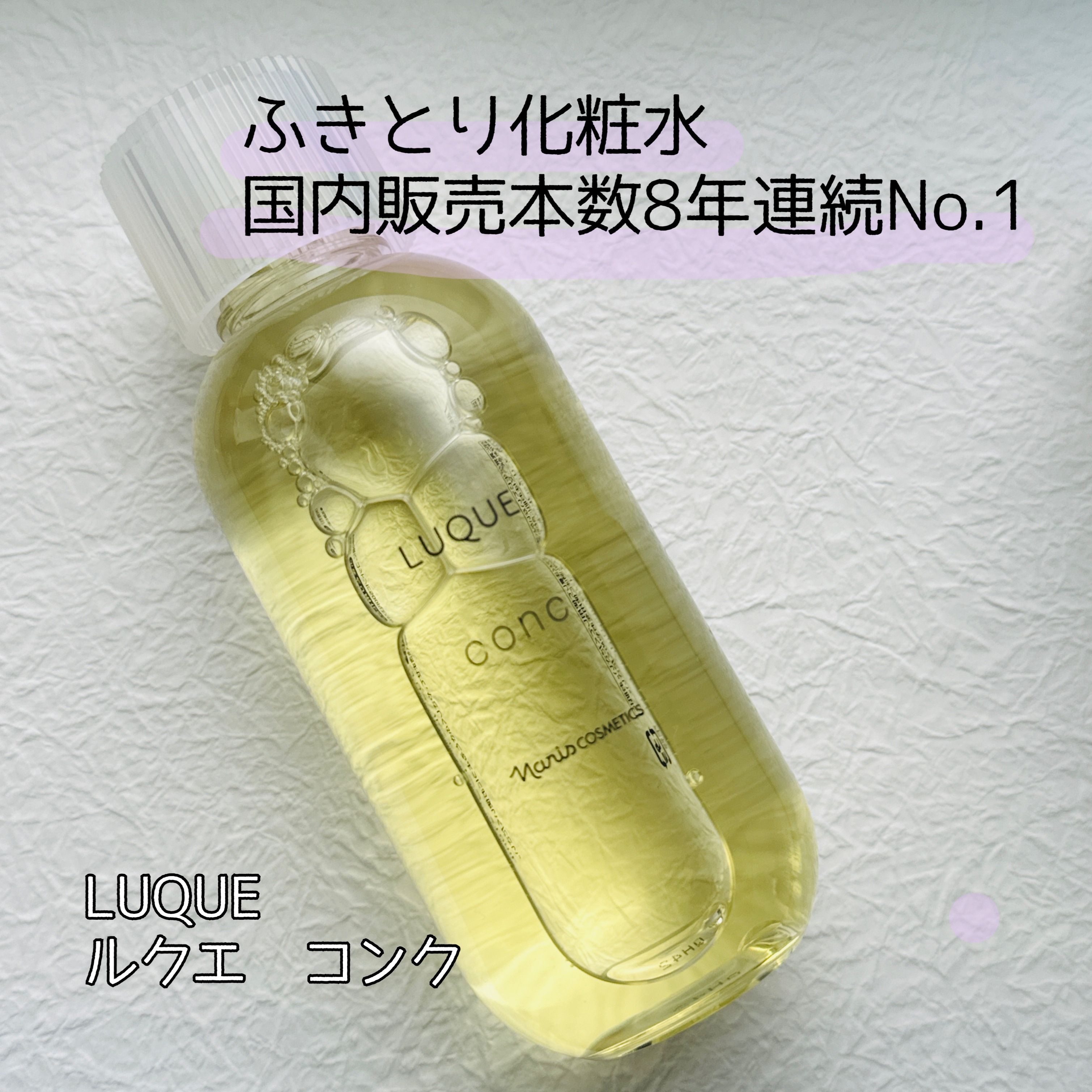 - ■毛穴、ザラつき、くすみ※1が気になる方に、不要な角質をふきとって、つるんとなめからかな肌へ。 ナリスのふきとり化粧水は、5年連続国内売上シェアNO.1※2 肌にとって余分な老化角質をおだやかに取り除き、素肌が持つ本来の美しさを引き出すルクエのコンク(ふきとり用化粧水)はナリスの80年以上続く研究開発によって誕生しました。 ●キレイのこたえは、ふきとり化粧水という選択。 植物保湿成分で古い角質をやさしくオフして、次に使うスキンケアアイテムのなじみをサポート。日々変化する肌をすこやかに整えます。毎日の“ふきとり習慣”で理想の肌に近づきましょう。 ●厳選した3つの植物の力で角層ケアをサポート。 ・柔らかくほぐして、取り除きやすくする「ヨクイニンエキス」※3 ・潤いを与え、健康的な角層へ導く「月見草エキス」※4 ・潤いを逃さず閉じ込める「白花豆エキス」※5 【使用方法】 1. 朝晩2回、洗顔後の後に。 2. コットンに8〜10滴程度(500円玉大)を含ませます。目安は、コットン裏側に染み込む程度。 3. できるだけ力を入れずに、やさしくなでるように顔全体を拭き取ります。 ※1古い角質による ※2ナリス化粧品 2015~2019年度 「ふきとり用化粧水」販売動向調査 TPCマーケティングリサーチ株式会社調べ※3 ハトムギ種子エキス(保湿成分) ※4 メマツヨイグサ種子エキス(保湿成分) ※5ベニバナインゲン種子エキス(保湿成分)