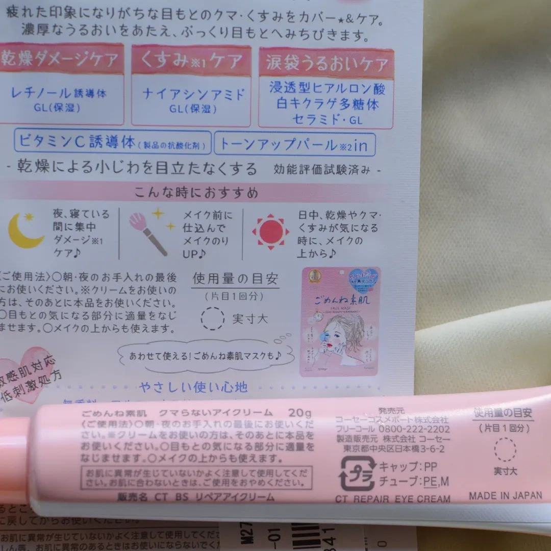 - 好調なごめんね素肌シリーズから、 若年層の目もと悩みを徹底ケアするアイクリームを新発売! ❶あらゆる目もと悩みを集中ケア!〈 乾燥ダメージ+くすみ※+涙袋うるおいケア 〉 濃厚なクリームで、乾燥やくすみ※の気にならない、ぷっくりうるおった目もとへみちびきます。 【乾燥ダメージケア】レチノール誘導体(保湿) 【くすみ※ケア】ナイアシンアミド・ビタミンC誘導体(保湿) 【涙袋うるおいケア】浸透型ヒアルロン酸・白キクラゲ多糖体・セラミド(保湿) ❷うるおいをあたえながら、クマ・くすみもカバー !※2すっぴんからキレイな目もとへ トーンアップパール配合!クマやくすみをナチュラルにカバーします。※2 ❸皮膚が薄く、デリケートな目もとにもやさしい使い心地 【低刺激処方】弱酸性 無香料 無鉱物油 アルコールフリー パラベンフリー(防腐剤) 紫外線吸収剤フリー シリコーンフリー 【各種試験済み】パッチテスト アレルギーテスト スティンギングテスト 敏感肌自覚者による連用テスト 乾燥小じわの効能評価試験済み (全ての方に、刺激やアレルギーなどが起きないというわけではありません) ※乾燥による ※2パールによるトーンアップ(メイク)効果のこと