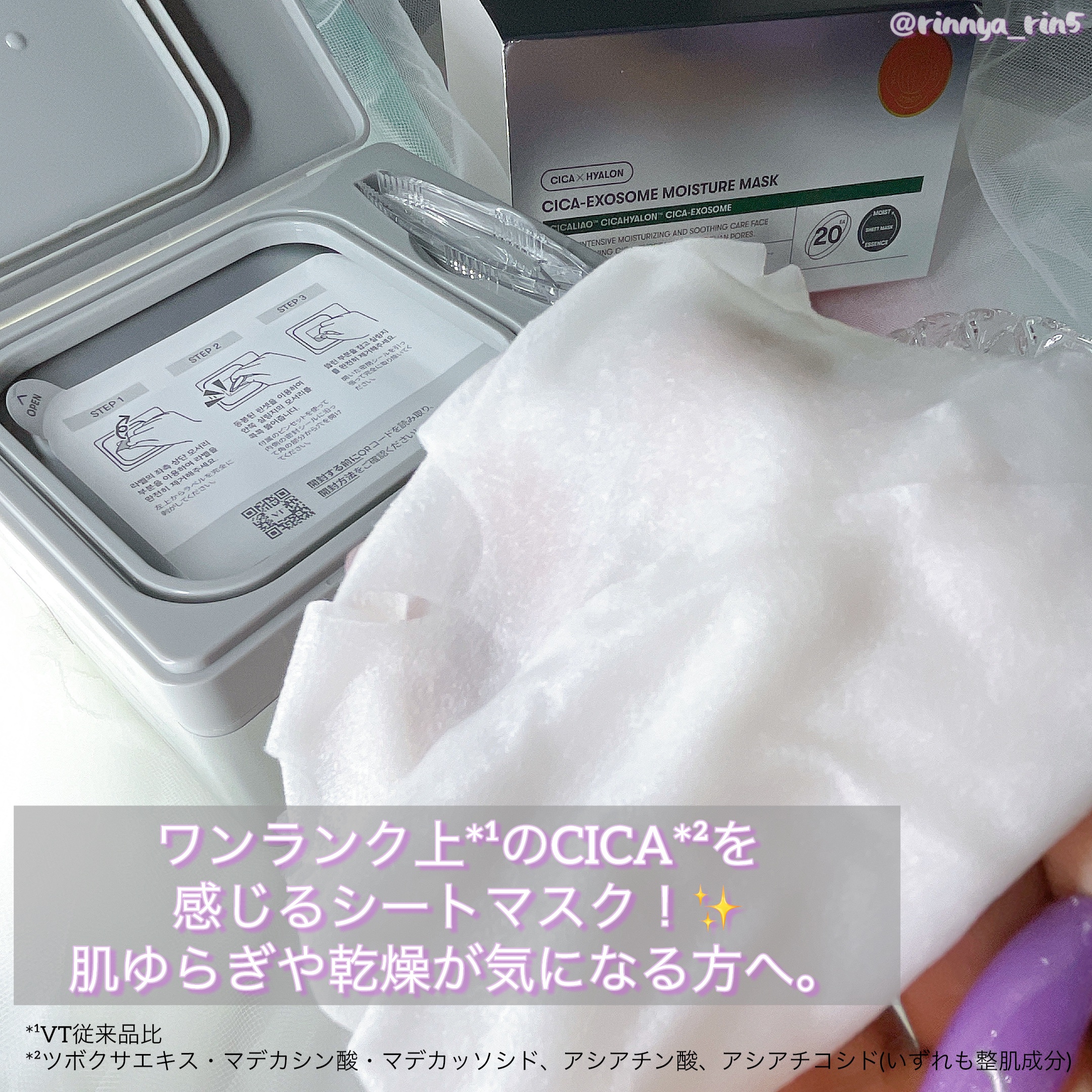 VTCICAエクソソームモイスチャーマスク使い切りです✨20枚入りでちょっと少なめの枚数なのが残念なところ😂マスクは結構大きめです!美容液もヒタヒタに含まれています👍ワンランク上のCICAを感じるシートマスク😊保湿、ゆらぎ肌に‼️角層まで潤い...