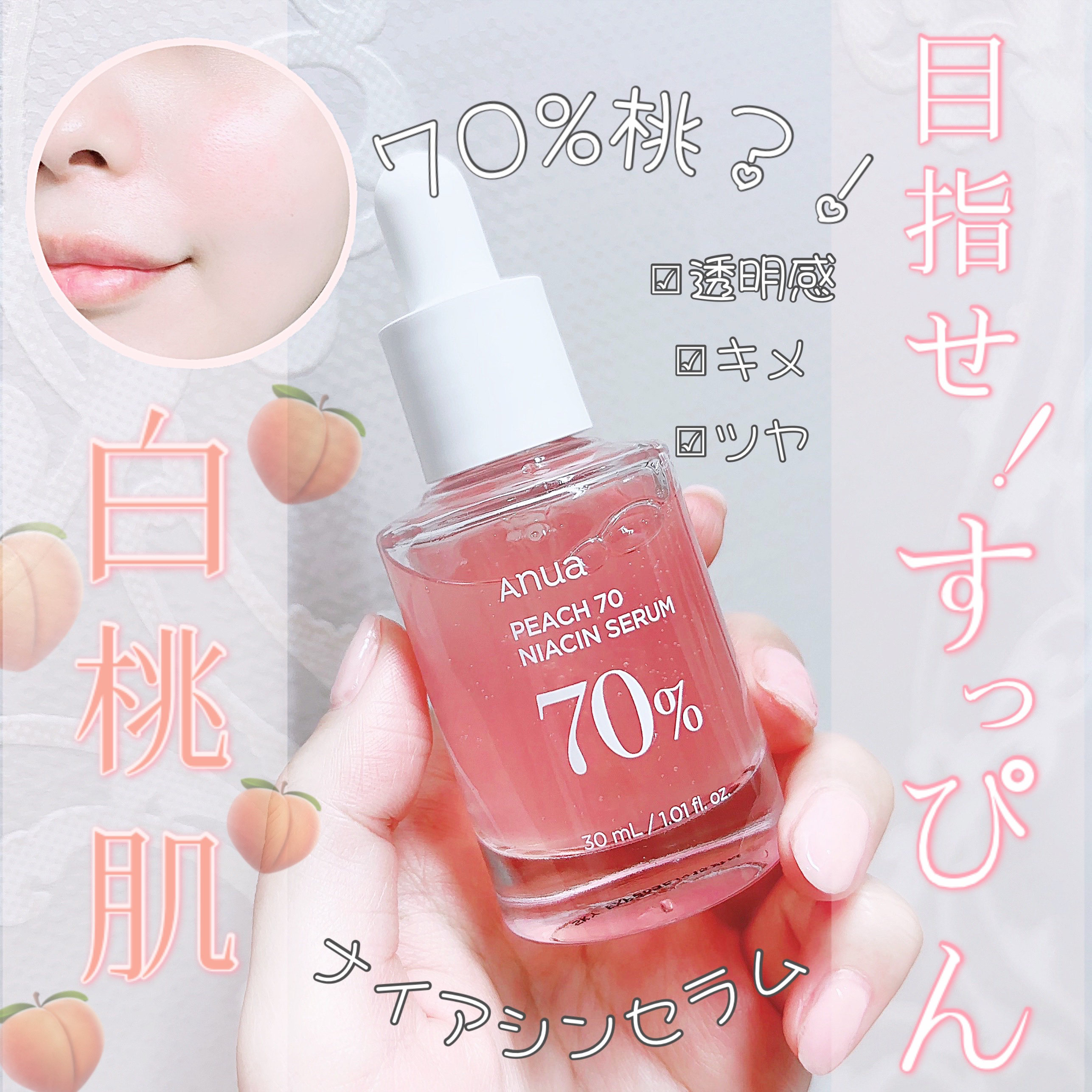 桃から抽出した自然由来成分、PEACHNIA(TM)を70%配合しており、たっぷり含まれるビタミン、ポリフェノール、タンニンなどの美容成分が肌を明るく輝かせる さらに、肌の透明感を上げるナイアシンアミドを5%配合しており、シミ・そばかすの元となるメラニンが肌表面に露出することを阻害して透明感のある、クリアな肌へ 天然由来のやさしい成分が肌にダメージを与えることなく、肌のトーン、キメ、ツヤが美しく整った、つるんと白桃肌を叶える キメが整って感動美容液🍑 メイク前に使ってもよれないし めちゃくちゃ使いやすい🥰 Anuaの桃シリーズ 優秀なのばっかりだ😲💓