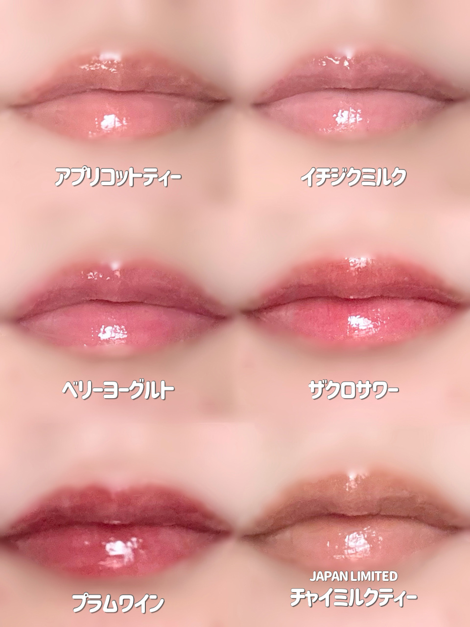 - <01 アプリコットティー> リンゴ酸ジイソステアリル、ダイマージリノール酸ダイマージリノレイルビス(ベヘニル/イソステアリル/フィトステリル)、ビスジグリセリルポリアシルアジペート-2、トリイソステアリン酸ポリグリセリル-2、水添ポリイソブテン、パラフィン、マイクロクリスタリンワックス、ウルシ果皮ロウ、ハチミツエキス、センチフォリアバラ花エキス、マンゴー果実エキス、カニナバラ果実エキス、アーモンド油、アルガニアスピノサ核油、アンズ核油、オリーブ果実油、シア脂、ツバキ種子油、ホホバ種子油、月見草油、BG、トリ(カプリル酸/カプリン酸)グリセリル、1,2-ヘキサンジオール、イソステアリン酸ソルビタン、酢酸トコフェロール、フェノキシエタノール、酸化鉄、酸化チタン、赤202、香料 <02 イチジクミルク> リンゴ酸ジイソステアリル、ダイマージリノール酸ダイマージリノレイルビス(ベヘニル/イソステアリル/フィトステリル)、ビスジグリセリルポリアシルアジペート-2、トリイソステアリン酸ポリグリセリル-2、水添ポリイソブテン、パラフィン、マイクロクリスタリンワックス、ウルシ果皮ロウ、ハチミツエキス、センチフォリアバラ花エキス、マンゴー果実エキス、カニナバラ果実エキス、アーモンド油、アルガニアスピノサ核油、シア脂、オリーブ果実油、アンズ核油、ツバキ種子油、ホホバ種子油、月見草油、BG、トリ(カプリル酸/カプリン酸)グリセリル、1,2-ヘキサンジオール、イソステアリン酸ソルビタン、酢酸トコフェロール、フェノキシエタノール、酸化鉄、酸化チタン、赤202、青1、香料 <03 ベリーヨーグルト> リンゴ酸ジイソステアリル、ダイマージリノール酸ダイマージリノレイルビス(ベヘニル/イソステアリル/フィトステリル)、ビスジグリセリルポリアシルアジペート-2、トリイソステアリン酸ポリグリセリル-2、水添ポリイソブテン、パラフィン、マイクロクリスタリンワックス、ウルシ果皮ロウ、ハチミツエキス、センチフォリアバラ花エキス、マンゴー果実エキス、カニナバラ果実エキス、アーモンド油、アルガニアスピノサ核油、シア脂、オリーブ果実油、アンズ核油、ツバキ種子油、ホホバ種子油、月見草油、BG、トリ(カプリル酸/カプリン酸)グリセリル、1,2-ヘキサンジオール、イソステアリン酸ソルビタン、酢酸トコフェロール、フェノキシエタノール、酸化鉄、酸化チタン、赤202、黄5、香料 <04 ザクロサワー> リンゴ酸ジイソステアリル、ダイマージリノール酸ダイマージリノレイルビス(ベヘニル/イソステアリル/フィトステリル)、ビスジグリセリルポリアシルアジペート-2、トリイソステアリン酸ポリグリセリル-2、水添ポリイソブテン、パラフィン、マイクロクリスタリンワックス、ウルシ果皮ロウ、ハチミツエキス、センチフォリアバラ花エキス、マンゴー果実エキス、カニナバラ果実エキス、アーモンド油、アルガニアスピノサ核油、シア脂、オリーブ果実油、アンズ核油、ツバキ種子油、ホホバ種子油、月見草油、BG、トリ(カプリル酸/カプリン酸)グリセリル、1,2-ヘキサンジオール、イソステアリン酸ソルビタン、酢酸トコフェロール、フェノキシエタノール、黄5、赤202、香料 <05 プラムワイン> リンゴ酸ジイソステアリル、ダイマージリノール酸ダイマージリノレイルビス(ベヘニル/イソステアリル/フィトステリル)、ビスジグリセリルポリアシルアジペート-2、トリイソステアリン酸ポリグリセリル-2、水添ポリイソブテン、パラフィン、マイクロクリスタリンワックス、ウルシ果皮ロウ、ハチミツエキス、センチフォリアバラ花エキス、マンゴー果実エキス、カニナバラ果実エキス、アーモンド油、アルガニアスピノサ核油、シア脂、オリーブ果実油、アンズ核油、ツバキ種子油、ホホバ種子油、月見草油、BG、トリ(カプリル酸/カプリン酸)グリセリル、1,2-ヘキサンジオール、イソステアリン酸ソルビタン、酢酸トコフェロール、フェノキシエタノール、酸化鉄、赤202、青1、香料 <06 チャイミルクティー> リンゴ酸ジイソステアリル、ダイマージリノール酸ダイマージリノレイルビス(ベヘニル/イソステアリル/フィトステリル)、ビスジグリセリルポリアシルアジペート-2、トリイソステアリン酸ポリグリセリル-2、水添ポリイソブテン、パラフィン、マイクロクリスタリンワックス、ハチミツエキス、センチフォリアバラ花エキス、マンゴー果実エキス、カニナバラ果実エキス、アーモンド油、アルガニアスピノサ核油、シア脂、オリーブ果実油、アンズ核油、ツバキ種子油、ホホバ種子油、月見草油、BG、トリ(カプリル酸/カプリン酸)グリセリル、水、1,2-ヘキサンジオール、イソステアリン酸ソルビタン、BHT、酢酸トコフェロール、フェノキシエタノール、酸化チタン、酸化鉄、香料 <21 ダーティチョコ> リンゴ酸ジイソステアリル、ダイマージリノール酸ダイマージリノレイルビス(ベヘニル/イソステアリル/フィトステリル)、ビスジグリセリルポリアシル