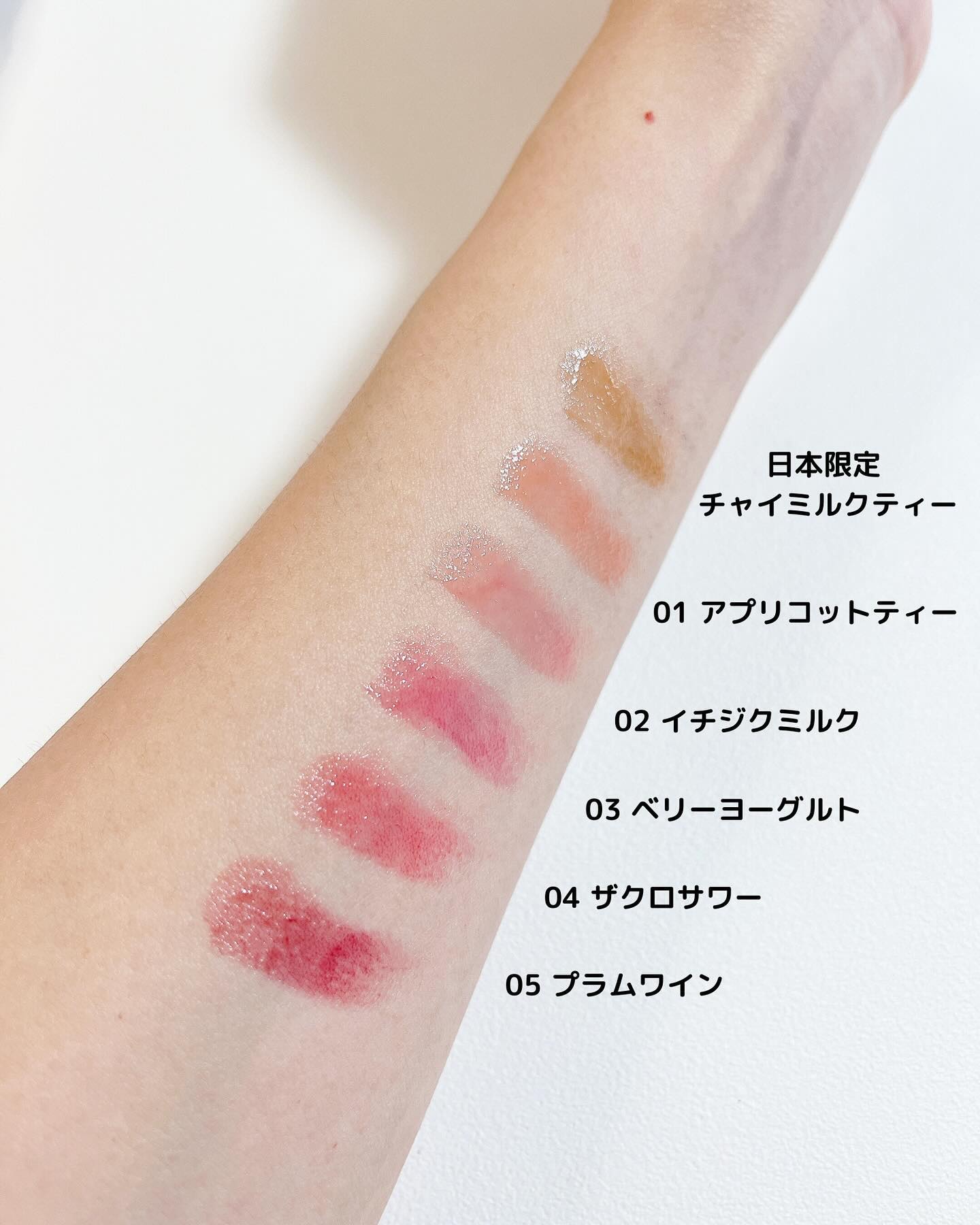 - <01 アプリコットティー> リンゴ酸ジイソステアリル、ダイマージリノール酸ダイマージリノレイルビス(ベヘニル/イソステアリル/フィトステリル)、ビスジグリセリルポリアシルアジペート-2、トリイソステアリン酸ポリグリセリル-2、水添ポリイソブテン、パラフィン、マイクロクリスタリンワックス、ウルシ果皮ロウ、ハチミツエキス、センチフォリアバラ花エキス、マンゴー果実エキス、カニナバラ果実エキス、アーモンド油、アルガニアスピノサ核油、アンズ核油、オリーブ果実油、シア脂、ツバキ種子油、ホホバ種子油、月見草油、BG、トリ(カプリル酸/カプリン酸)グリセリル、1,2-ヘキサンジオール、イソステアリン酸ソルビタン、酢酸トコフェロール、フェノキシエタノール、酸化鉄、酸化チタン、赤202、香料 <02 イチジクミルク> リンゴ酸ジイソステアリル、ダイマージリノール酸ダイマージリノレイルビス(ベヘニル/イソステアリル/フィトステリル)、ビスジグリセリルポリアシルアジペート-2、トリイソステアリン酸ポリグリセリル-2、水添ポリイソブテン、パラフィン、マイクロクリスタリンワックス、ウルシ果皮ロウ、ハチミツエキス、センチフォリアバラ花エキス、マンゴー果実エキス、カニナバラ果実エキス、アーモンド油、アルガニアスピノサ核油、シア脂、オリーブ果実油、アンズ核油、ツバキ種子油、ホホバ種子油、月見草油、BG、トリ(カプリル酸/カプリン酸)グリセリル、1,2-ヘキサンジオール、イソステアリン酸ソルビタン、酢酸トコフェロール、フェノキシエタノール、酸化鉄、酸化チタン、赤202、青1、香料 <03 ベリーヨーグルト> リンゴ酸ジイソステアリル、ダイマージリノール酸ダイマージリノレイルビス(ベヘニル/イソステアリル/フィトステリル)、ビスジグリセリルポリアシルアジペート-2、トリイソステアリン酸ポリグリセリル-2、水添ポリイソブテン、パラフィン、マイクロクリスタリンワックス、ウルシ果皮ロウ、ハチミツエキス、センチフォリアバラ花エキス、マンゴー果実エキス、カニナバラ果実エキス、アーモンド油、アルガニアスピノサ核油、シア脂、オリーブ果実油、アンズ核油、ツバキ種子油、ホホバ種子油、月見草油、BG、トリ(カプリル酸/カプリン酸)グリセリル、1,2-ヘキサンジオール、イソステアリン酸ソルビタン、酢酸トコフェロール、フェノキシエタノール、酸化鉄、酸化チタン、赤202、黄5、香料 <04 ザクロサワー> リンゴ酸ジイソステアリル、ダイマージリノール酸ダイマージリノレイルビス(ベヘニル/イソステアリル/フィトステリル)、ビスジグリセリルポリアシルアジペート-2、トリイソステアリン酸ポリグリセリル-2、水添ポリイソブテン、パラフィン、マイクロクリスタリンワックス、ウルシ果皮ロウ、ハチミツエキス、センチフォリアバラ花エキス、マンゴー果実エキス、カニナバラ果実エキス、アーモンド油、アルガニアスピノサ核油、シア脂、オリーブ果実油、アンズ核油、ツバキ種子油、ホホバ種子油、月見草油、BG、トリ(カプリル酸/カプリン酸)グリセリル、1,2-ヘキサンジオール、イソステアリン酸ソルビタン、酢酸トコフェロール、フェノキシエタノール、黄5、赤202、香料 <05 プラムワイン> リンゴ酸ジイソステアリル、ダイマージリノール酸ダイマージリノレイルビス(ベヘニル/イソステアリル/フィトステリル)、ビスジグリセリルポリアシルアジペート-2、トリイソステアリン酸ポリグリセリル-2、水添ポリイソブテン、パラフィン、マイクロクリスタリンワックス、ウルシ果皮ロウ、ハチミツエキス、センチフォリアバラ花エキス、マンゴー果実エキス、カニナバラ果実エキス、アーモンド油、アルガニアスピノサ核油、シア脂、オリーブ果実油、アンズ核油、ツバキ種子油、ホホバ種子油、月見草油、BG、トリ(カプリル酸/カプリン酸)グリセリル、1,2-ヘキサンジオール、イソステアリン酸ソルビタン、酢酸トコフェロール、フェノキシエタノール、酸化鉄、赤202、青1、香料 <06 チャイミルクティー> リンゴ酸ジイソステアリル、ダイマージリノール酸ダイマージリノレイルビス(ベヘニル/イソステアリル/フィトステリル)、ビスジグリセリルポリアシルアジペート-2、トリイソステアリン酸ポリグリセリル-2、水添ポリイソブテン、パラフィン、マイクロクリスタリンワックス、ハチミツエキス、センチフォリアバラ花エキス、マンゴー果実エキス、カニナバラ果実エキス、アーモンド油、アルガニアスピノサ核油、シア脂、オリーブ果実油、アンズ核油、ツバキ種子油、ホホバ種子油、月見草油、BG、トリ(カプリル酸/カプリン酸)グリセリル、水、1,2-ヘキサンジオール、イソステアリン酸ソルビタン、BHT、酢酸トコフェロール、フェノキシエタノール、酸化チタン、酸化鉄、香料 <21 ダーティチョコ> リンゴ酸ジイソステアリル、ダイマージリノール酸ダイマージリノレイルビス(ベヘニル/イソステアリル/フィトステリル)、ビスジグリセリルポリアシル