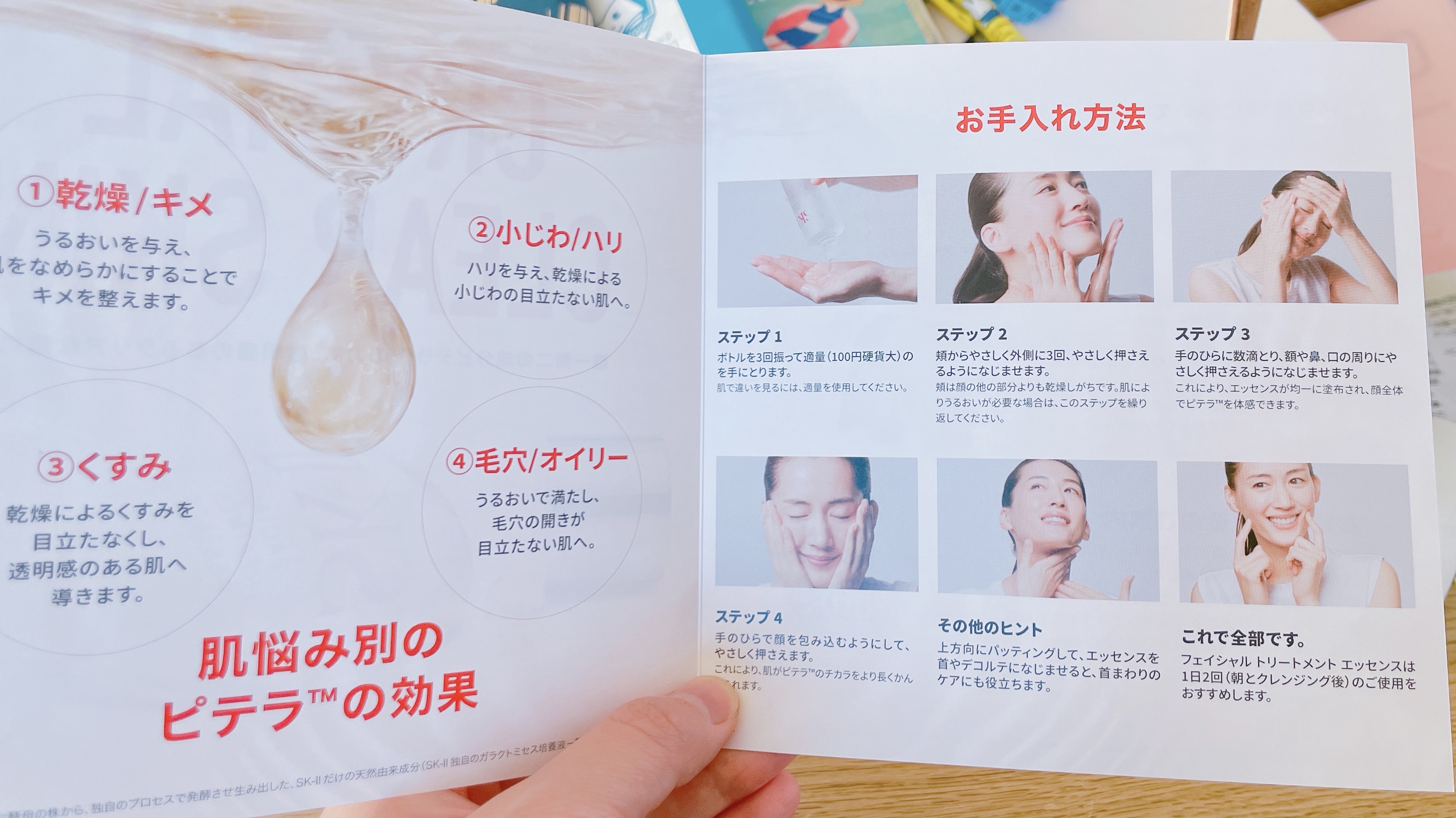- SK-II独自のピテラ™を90%以上含む、SK-IIを代表するエッセンスです。 ピテラ™が美しい肌に必要な要素に働きかけ、揺らぎやすい肌のコンディションを整えます。 そして使うほどに、潤いあふれるクリアな素肌へ導きます。 ●ピテラ™とは? SK-II独自の特別な酵母の発酵過程で生み出され、肌の中に本来存在する天然保湿因子(NMF)のいくつかを含みます。また、ビタミン類、ミネラル類、アミノ酸類など50種類を超える有用成分を含み、肌本来の働きを整えます。 ●得られる効果 ・ツヤを与える ・くすみを防ぐ ・エイジングケア ・キメを整える ・ハリを与える