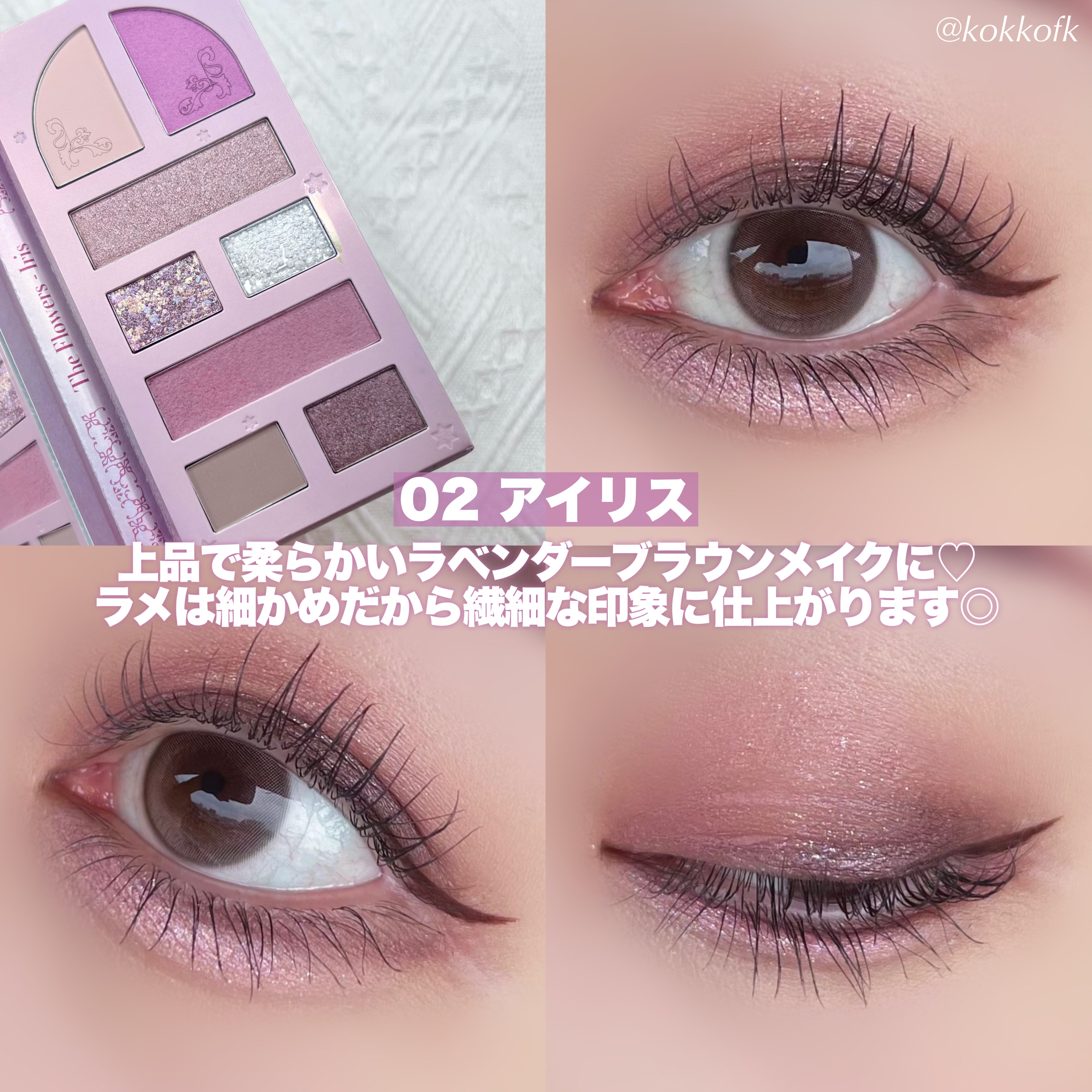 W デイリームードアップパレット01 ソフトモーブピンク (¥2420) プロ アイ パレット13 PICNIC BY THE SUNSET, グラムチェンジマルチパレット04 ユニコーンピンク (¥1890) グリッターぺディアアイパレットN°4 オールラベンダーフォグ (¥2950) シャドウパレット16 バイオレットニット (¥3610) ベターザンパレット06 PEONY NUDE GARDEN, 09 DREAMY LILAC GARDEN (¥2900)