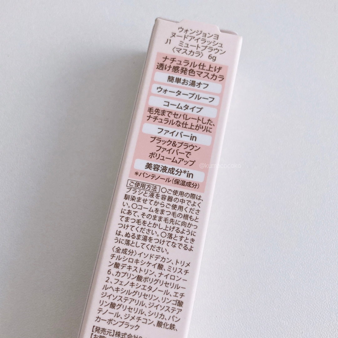 - ナチュラル仕上げ 透け感発色マスカラ ・簡単お湯オフ&ウォータープルーフ処方 ・コームタイプ 毛先までセパレートした、ナチュラルな仕上がりに ・ブラック&ブラウンファイバーinでボリュームアップ ・2種の美容液成分in(すべて保湿成分) パンテノール/オクタペプチド-2