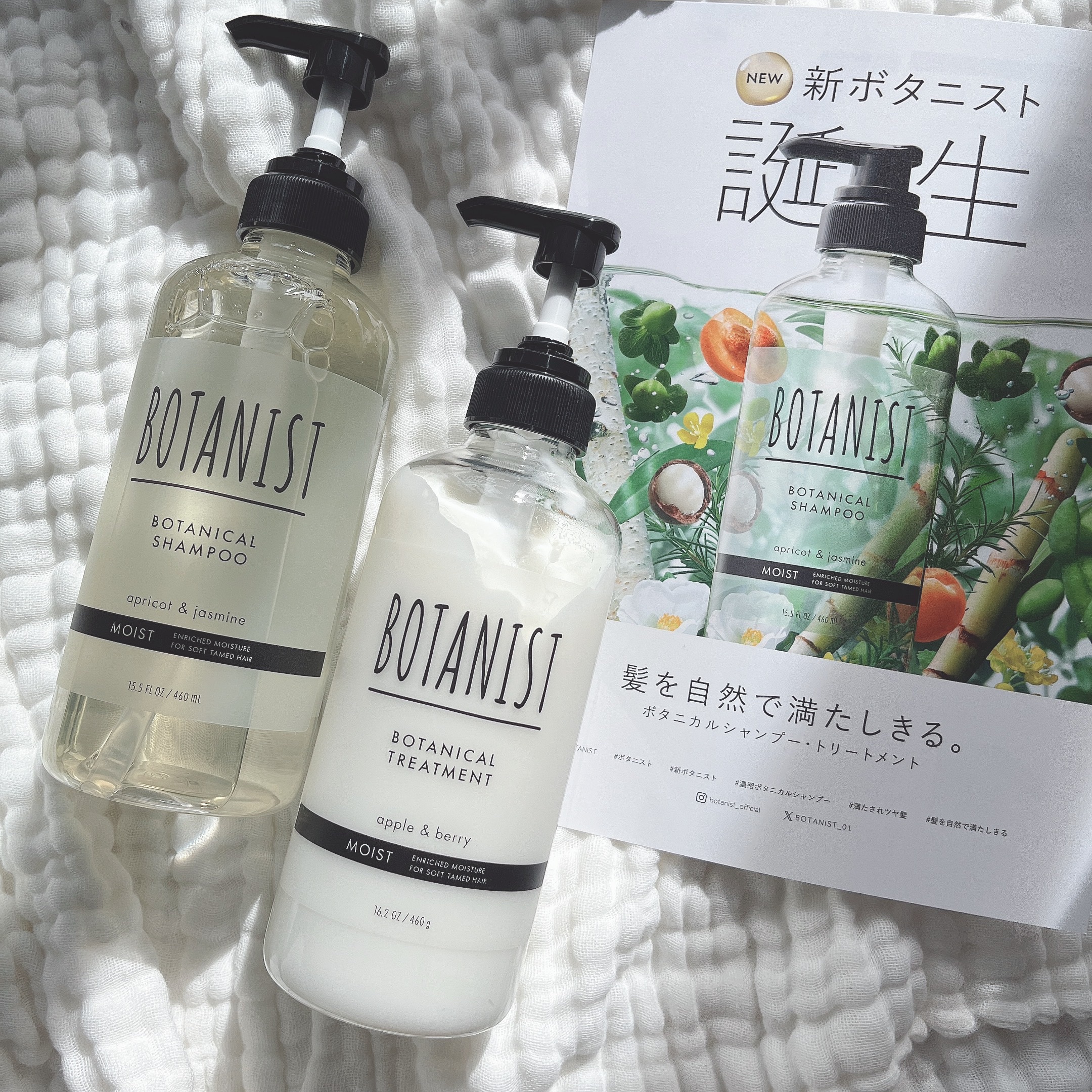 - モイスト:まとまりのある、しっとりとした髪→アプリコットオイル*13 *13 アンズ核油(保湿成分) 1. 新配合成分を含む共通成分「新 濃密ボタニカル美容液***」で3つのケアを叶える <地肌ケア成分> スキンケアレベルで頭皮の潤いを保つことで、乾燥によるかゆみ・フケを抑えます。 ・北海道産 白樺発酵エキス*5【新配合】 白樺発酵エキスに含まれるガラクトミセス培養液が地肌に潤いを与えます。 ・北海道産 白樺樹液*6 ミネラル等の有用成分に富み、美容効果が高いことから 天然の化粧水と言われています。 <乾燥ケア成分> 毛髪内部と表面にアプローチし、キューティクルを接着することでうるおいをキープします。 ・香川県産サトウキビ由来の糖蜜*7【新配合】 髪に必要なアミノ酸、ミネラル、ビタミンと保湿成分の「糖」を含み、髪をコートすることで潤いある髪へ導きます。また、和三盆糖の製造過程で生まれる副産物を有効活用することで、サステナビリティにも貢献しています。 ・国産のお米由来のセラミド*8【新配合】 合成界面活性剤や有機溶剤を使用せずに、高純度のスフィンゴ糖脂質 (植物セラミド) を水にナノ化分散させた原料。髪内部に浸透して保湿し、潤いを与えます。 <ダメージケア成分> タンパク質・脂質由来の微細な植物成分がダメージ髪を補修します。 ・マカダミアナッツ由来のリペアセラム*9【新配合】 マカダミアナッツに含まれる脂肪酸をナノカプセル化、髪内部に浸透してキューティクルを密着補修。髪のダメージホール等を補修し、髪に必要な潤いを補うことで、しなやかで、潤いとツヤのある髪に導きます。 ・ボタニカルマイクロプロテイン*10 ケラチンよりも小さな粒子で、髪の内部に浸透する植物由来ケラチン類似物質。 なめらかでツヤやかな髪へ導きます。 *** シラカンバ樹液、ガラクトミセス/シラカンバ樹液発酵液、トウミツ、スフィンゴ糖脂質(全て保湿成分)、マカデミアナッツ脂肪酸フィトステリル、加水分解野菜タンパク(全て毛髪補修成分) *5 ガラクトミセス/シラカンバ樹液発酵液(保湿成分) *6 シラカンバ樹液(保湿成分) *7 トウミツ(保湿成分) *8 スフィンゴ糖脂質(保湿成分) *9 マカデミアナッツ脂肪酸フィトステリル(毛髪補修成分) *10 加水分解野菜タンパク(毛髪補修成分) 2.髪の構成要素へ着目し、必要なものを必要なだけいたわりながら補う 髪に必要な「水分・脂質・タンパク質」由来の植物成分を髪の内側まで浸透させ、髪を根本からケアし、潤いに満ちたしなやかな髪に仕上げます。 ▶︎水分 :北海道産の白樺発酵エキス*5×白樺樹液*6、香川県産サトウキビ由来の糖蜜*7、国産お米由来のナノセラミド*8 ▶脂質 :マカダミアナッツオイル由来のナノリペアセラム*9 ▶タンパク質 :ボタニカルマイクロプロテイン*10 *5 ガラクトミセス/シラカンバ樹液発酵液(保湿成分) *6 シラカンバ樹液(保湿成分) *7 トウミツ(保湿成分) *8 スフィンゴ糖脂質(保湿成分) *9 マカデミアナッツ脂肪酸フィトステリル(毛髪補修成分) *10 加水分解野菜タンパク(毛髪補修成分) 3.なりたい仕上がりに合わせて「新 濃密ボタニカル美容液***」を独自比率で配合 髪・頭皮の状態に合わせ濃密ボタニカル美容液***の配合比率を変えることで、理想的な仕上がりを目指すことができます。また、シリーズごとに厳選された植物由来成分を配合しています。 *** スフィンゴ糖脂質(保湿成分)、マカデミアナッツ脂肪酸フィトステリル(毛髪補修成分)、 シラカンバ樹液(保湿成分)、ガラクトミセス/シラカンバ樹液発酵液(保湿成分)、トウミツ(保湿成分)、加水分解野菜タンパク(毛髪補修成分) 4.香り彩る、ダブルフレグランス ケアのステップに合わせて広がりが生まれるよう、同じシリーズでもシャンプーとトリートメントで異なる香りを採用。セットで使うことで、BOTANIST独自の香りの世界は一層魅力を増します。 モイスト:シャンプー: 華やかで優雅なアプリコットとジャスミンの香り トリートメント:上品で甘美なアップルとベリーの香り 5.環境に配慮したパッケージと原料へアップデート、よりサステナブルなブランドへ 【パッケージの環境対応】 従来品から引き続き、ボトルには再生可能な有機資源を原料とするバイオマスプラスチックを採用。 さらに、今回のフルリニューアルでは、容器ラベルのインクを環境負担の少ない植物由来のバイオマスインキ、アテンションシールを使用済みペットボトルから作られた再生PETに変更しました。