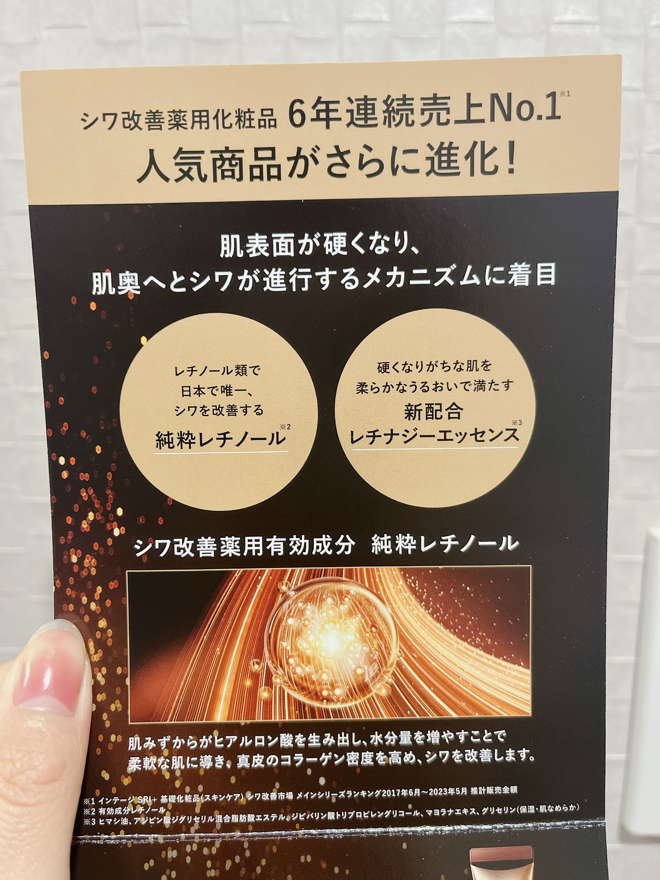 - 【医薬部外品】 目もと口もとのシワに深く効く。純粋レチノール※1がシワを改善し、ふっくら柔らかな「つや玉」輝く肌へ。 ※1 有効成分レチノール ○レチノール類において日本で唯一、シワ改善効果が認められた薬用有効成分「純粋レチノール※1」配合 ヒアルロン酸を生み出し、水分量を増やすことで、柔軟な肌に導き、真皮のコラーゲン密度を高め、シワを改善する ○硬くなりがちな肌をやわらかなうるおいで満たす独自成分 「レチナジーエッセンス※5」配合 ※5 ヒマシ油、アジピン酸ジグリセリル混合脂肪酸エステル、ジピバリン酸トリプロピレングリコール、マヨラナエキス、グリセリン(保湿・肌なめらか) ○リラックス感のある心地よいアクアフローラルの香り ○デリケートな純粋レチノールの効果を守るため、光・酸素の侵入を防ぐ特殊容器を採用 ○アレルギーテスト済み(全てのかたにアレルギーが起きないというわけではありません。)