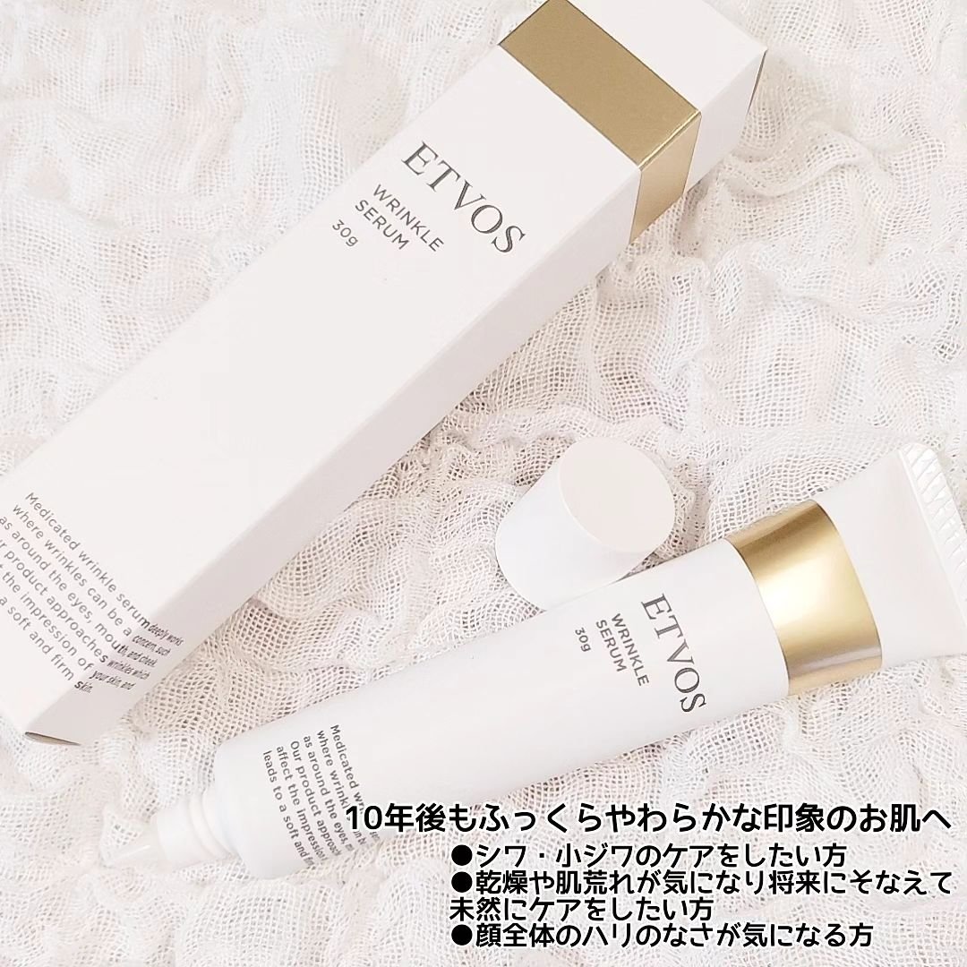 目元、口元、頬などのシワの気になるところに!エトヴォス薬用リンクルセラムエトヴォスのリンクルセラムです♡触り心地としてはべたつかず軽いのに、馴染ませるとしっとりしてくれる感覚があり、夏のスキンケアに丁度良い質感。保湿はしたいけれど、べたつくの...