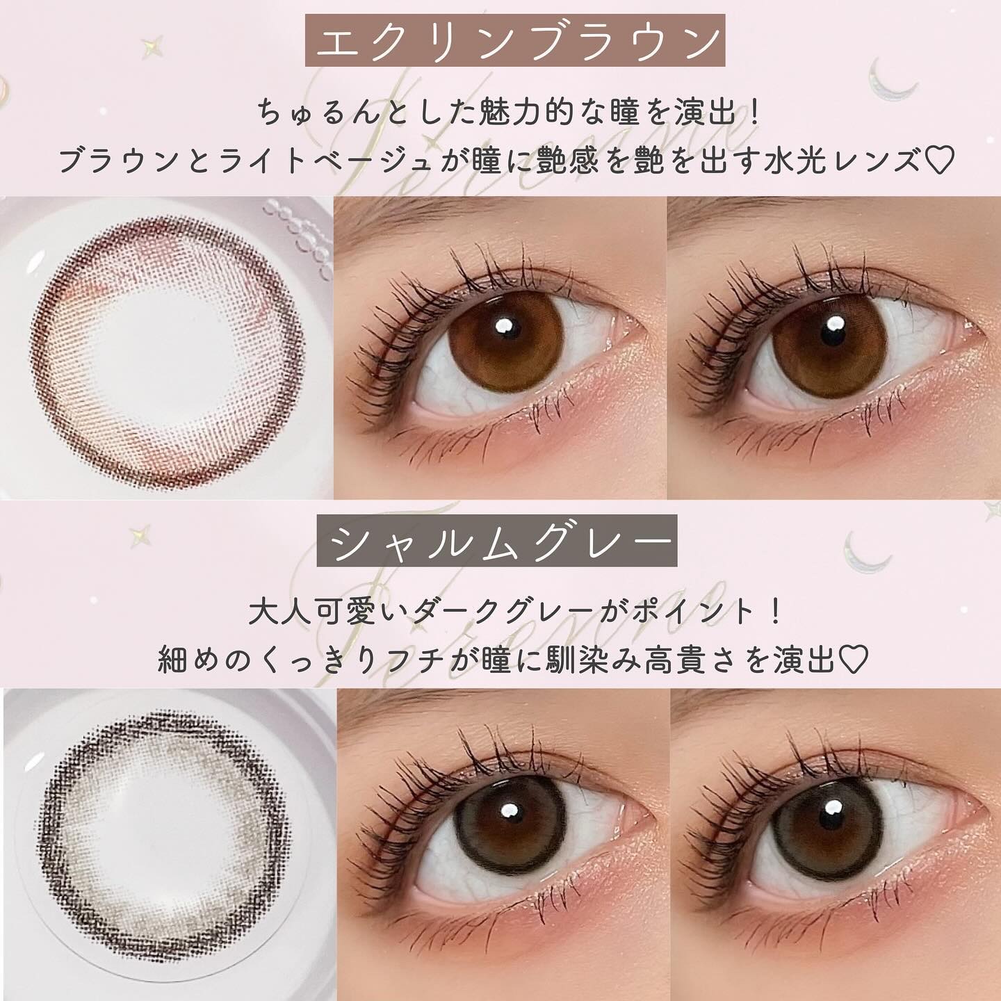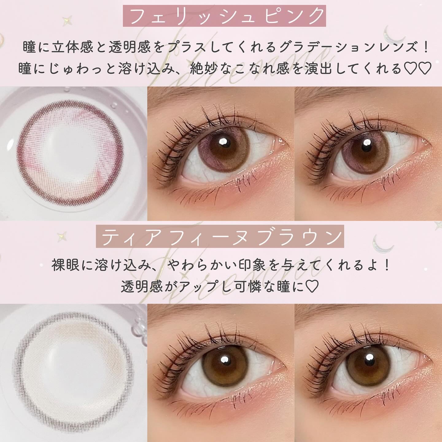 - ■Eccrine Brown(エクリンブラウン) DIA:14.2mm/着色外径:13.3mm ちゅるんとした魅力的な瞳を演出。 ブラウンとライトベージュが瞳に艶感を出す水光レンズ。 ■Charme Gray(シャルムグレー) DIA:14.2mm/着色外径:12.7mm 大人可愛いダークグレーがポイント。 細めのくっきりフチが瞳に馴染み高貴さを演出。 ■Tierphine Brown(ティアフィーヌブラウン) DIA:14.2mm/着色外径:12.3mm 裸眼に溶け込むようになじみ、やわらかい印象を与えてくれる。 透明感溢れる可憐な瞳を演出 ■Ferrish Pink(フェリッシュピンク) DIA:14.2mm/着色外径:13.3mm 瞳に立体感と透明感をプラスしてくれるグラデーションレンズ。 瞳にじゅわっと溶け込むようになじみ、絶妙なこなれ感を演出してくれる。 コンタクトレンズの不適正使用による眼障害の危険性等などがあります。 ●コンタクトレンズは高度管理医療機器です。不十分な洗浄・消毒など不適切なケアや、長時間・交換期間を超えた装用により、アレルギー性結膜炎、角膜感染症、角膜潰瘍等の重篤な眼障害が発生する危険性があります ●ご使用前に取扱説明書を確認してください 使用上の留意事項 ●眼科医院等を受診してからお求めください ●眼に異常を感じたら直ちにレンズ使用を中止し、お近くの眼科等で診察を受けてください ●医師の指示にしたがってご使用ください ●コンタクトレンズを装用する場合、自覚症状がなくても、眼科医院等での定期検査を受けてください ●レンズに不具合がある場合は使用しないでください
