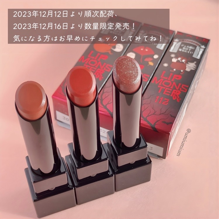 - 落ちにくさも美発色もよくばりたい、つけたての色が長時間持続する人気の口紅リップモンスター。 唇から蒸発する水分を活用して密着ジェル膜に変化する独自技術※で、つけたての色が長時間持続。 高発色&保湿。 ※当社独自の色持ち技術 ■花火のようにまぶしくきらめく 繊細なラメが際立つ限定色 EX-6 ピンクカラー×青ラメ【ロケット花火流星群】 EX-7 オレンジカラー×黄&緑ラメ【100万発の線香花火】 EX-8 レッドカラー×緑ラメ【打ち上げ花火ブランコ】 ■深みレッド系カラーの限定色 EX-9 戦慄の喜笑 (限定色) EX-10 狂気の怒号 (限定色) 【2025クリスマスコフレ】 落ちにくいリップモンスターから、唇の血色感を底上げする ホリデーシーズン限定の熱感ニュアンスベージュ系カラー登場。 EX-11 紅煙宿る贈り物(限定色):ボルドーベージュ系 EX-12 盗まれた1224mの星光(限定色):キャメルベージュ系