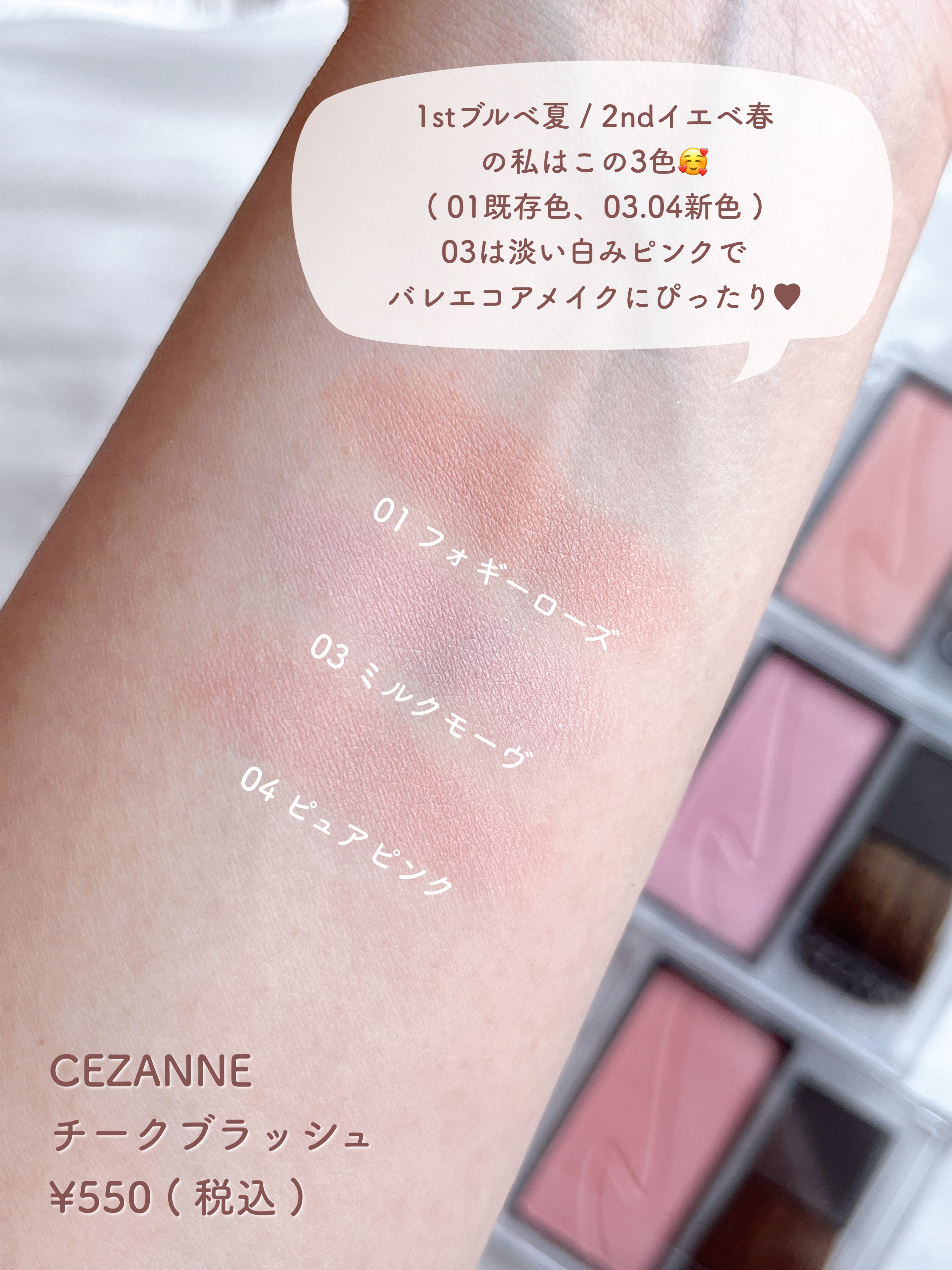 バレエコアメイク、可愛すぎます…💘 グラスティングウォーターティントの新色良いですね😍 私もセザンヌのチークの03買いました!! 白みピンクで可愛いですよね🫶