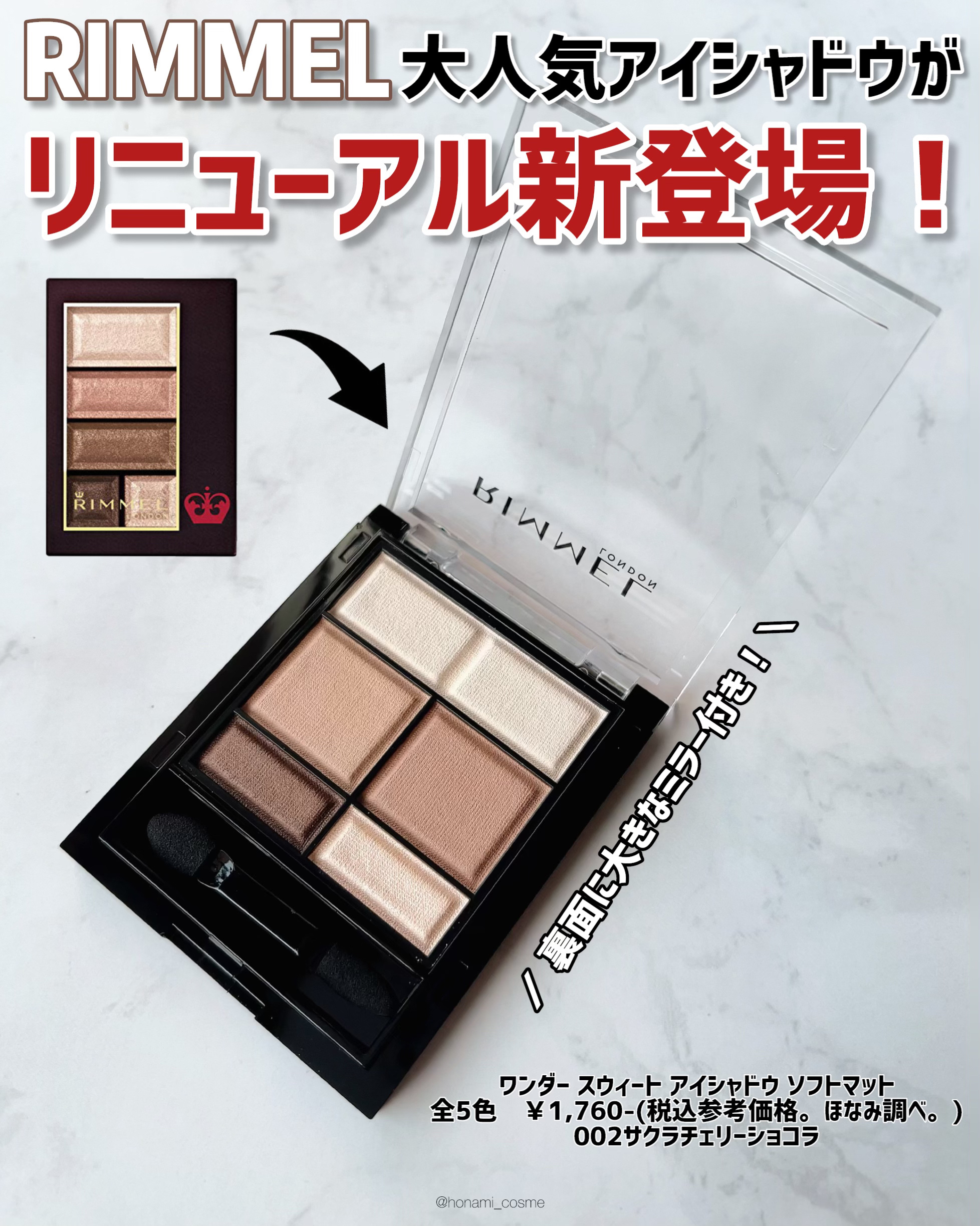 プチプラとは思えない上品さ💠 RIMMEL @rimmellondon_jp ワンダー スウィート アイシャドウ ソフトマット 相変わらずの粉質の良さでグラデが作りやすい!!ラメは"ほのツヤパール"と銘打ってるほんのりツヤとラメが足される絶妙具合🥹 ほんのりなパール感が上品さを際立ててくれて私大人なメイクしてます!!(でも実はプチプラ)っていう雰囲気を楽しめるよ💗
