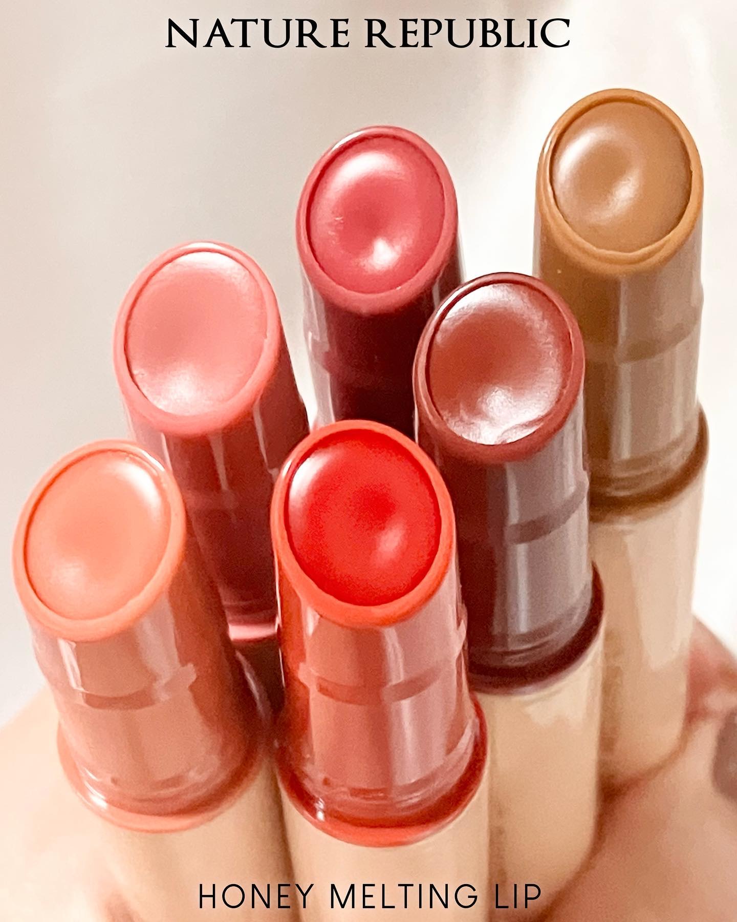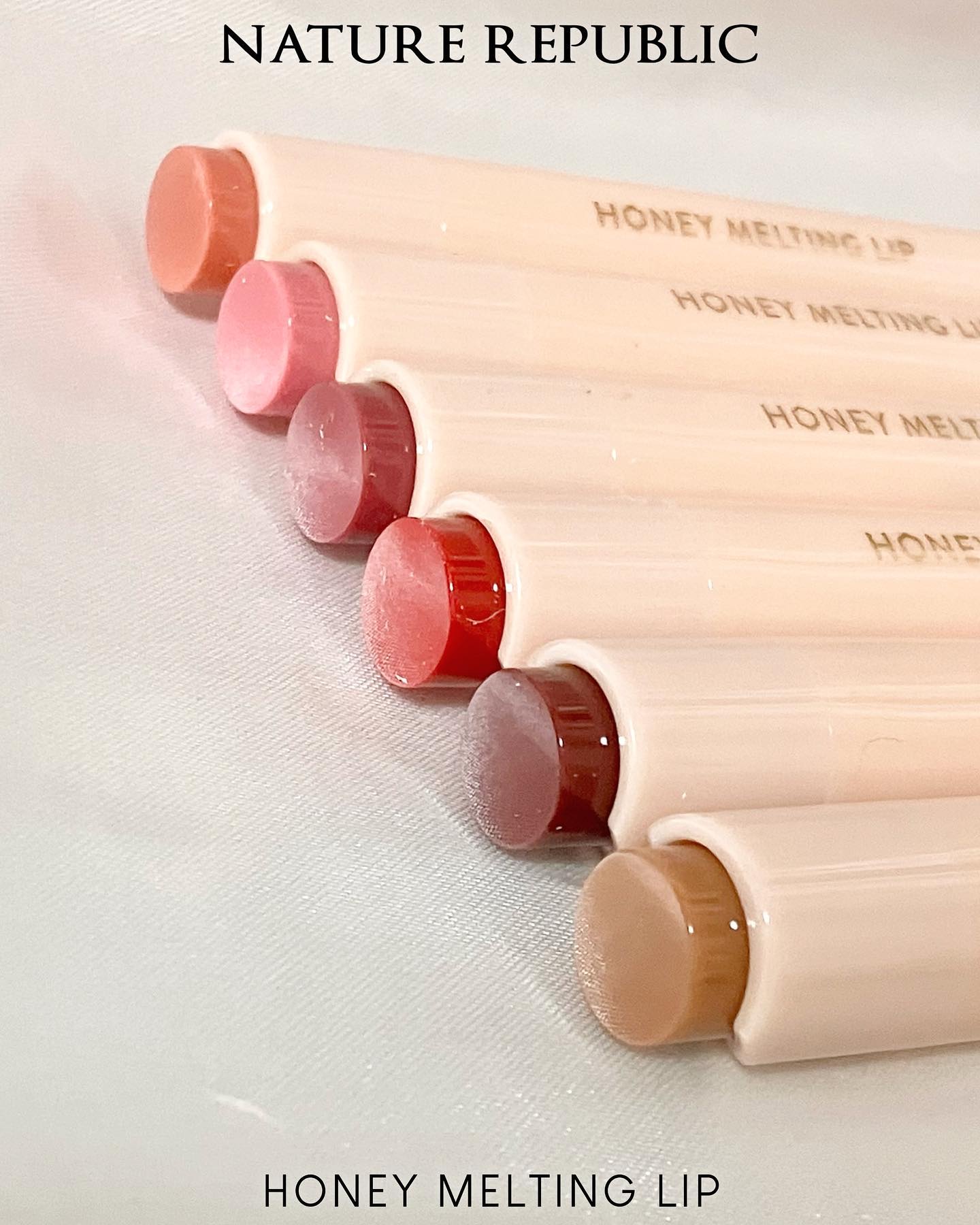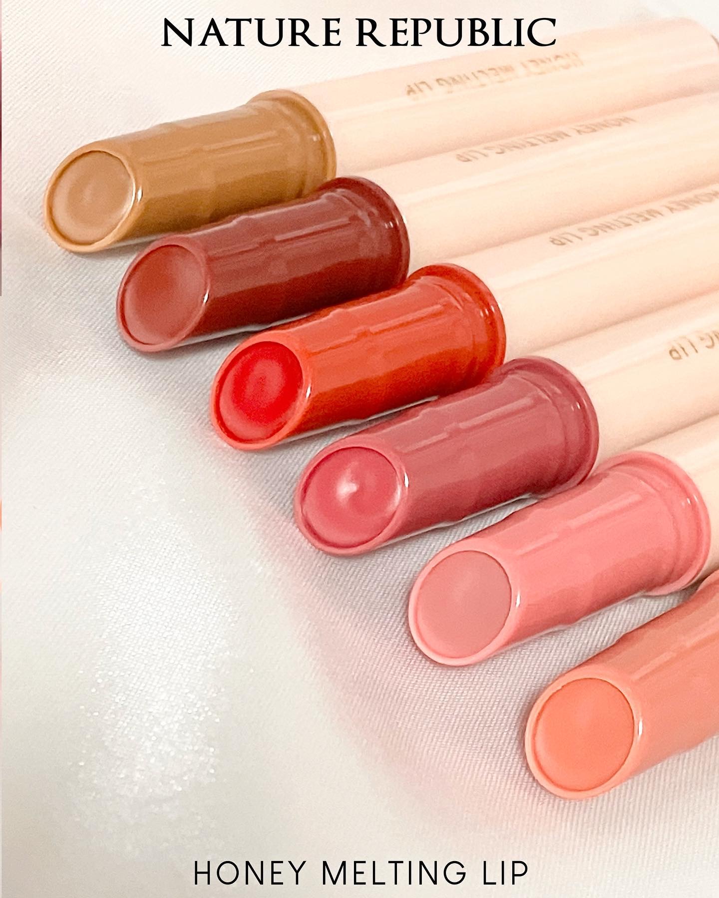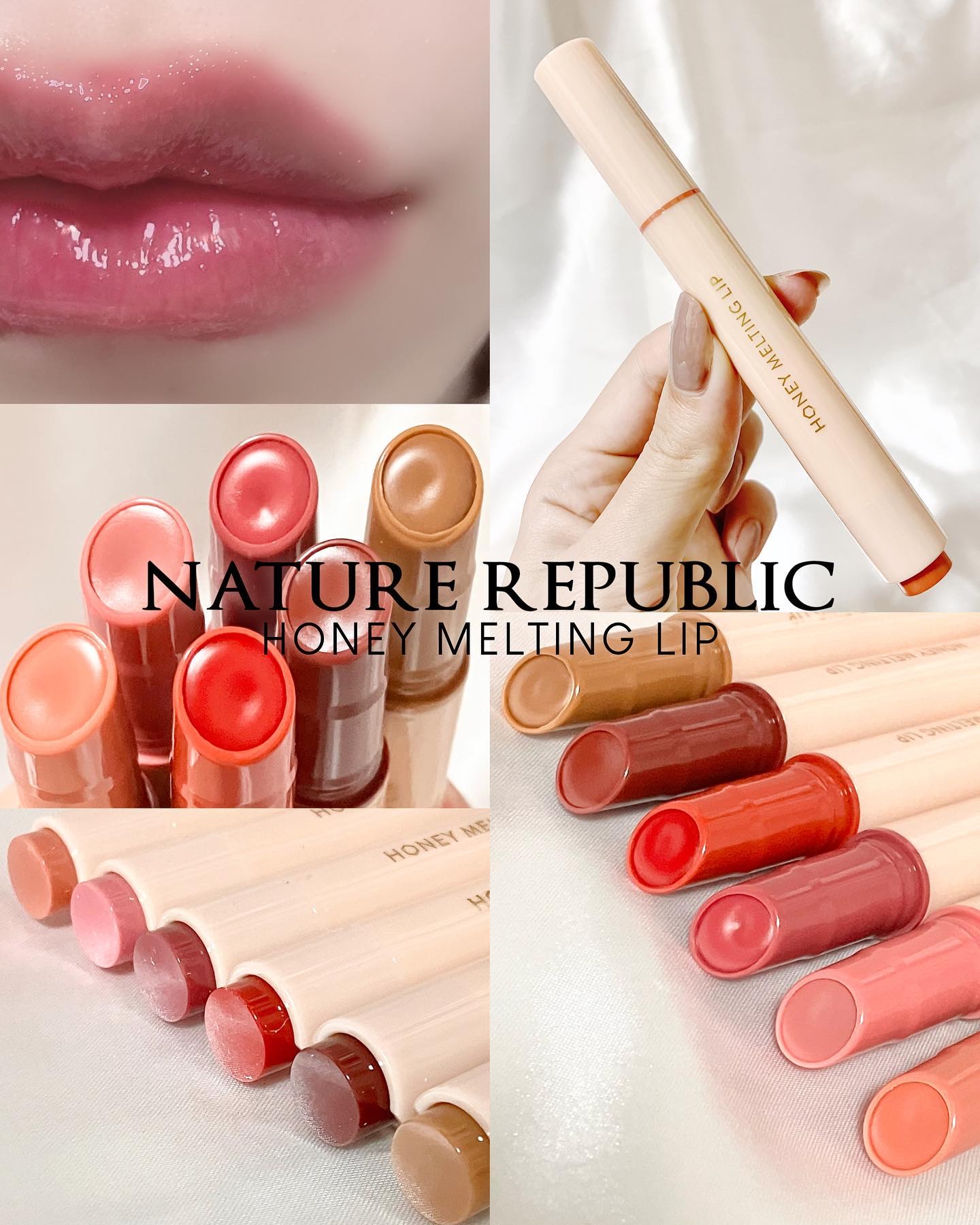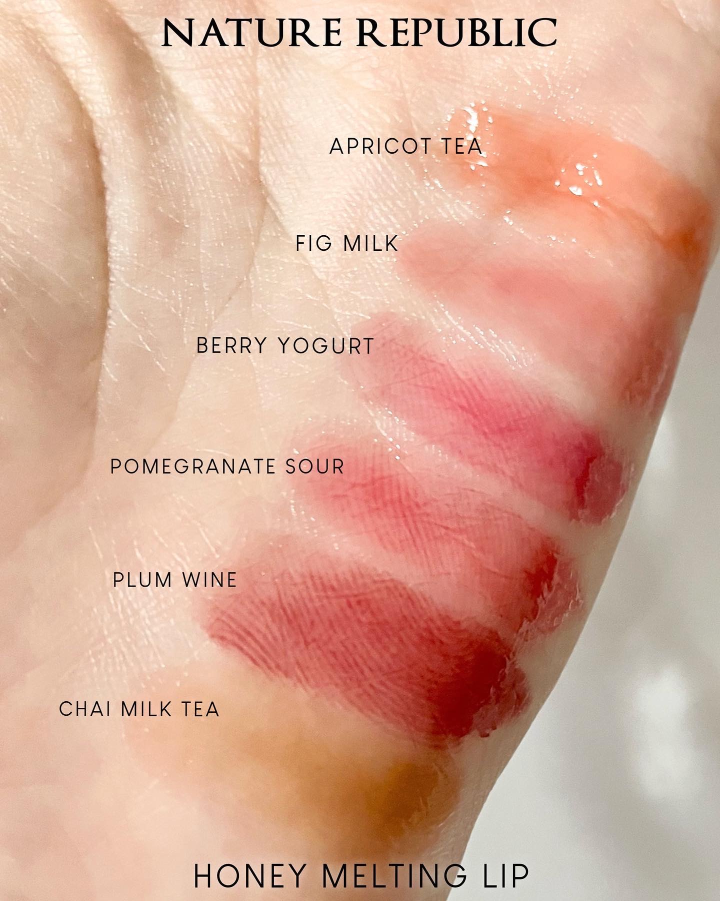 ネイチャーリパブリック ハニーメルティングリップ 01 アプリコットティー 02 イチジクミルク 03 ベリーヨーグルト 04 ザクロサワー 05 プラムワイン 06 チャイミルクティー #韓国コスメ #韓国リップ #ツヤリップ #冬顔メイクテクニック