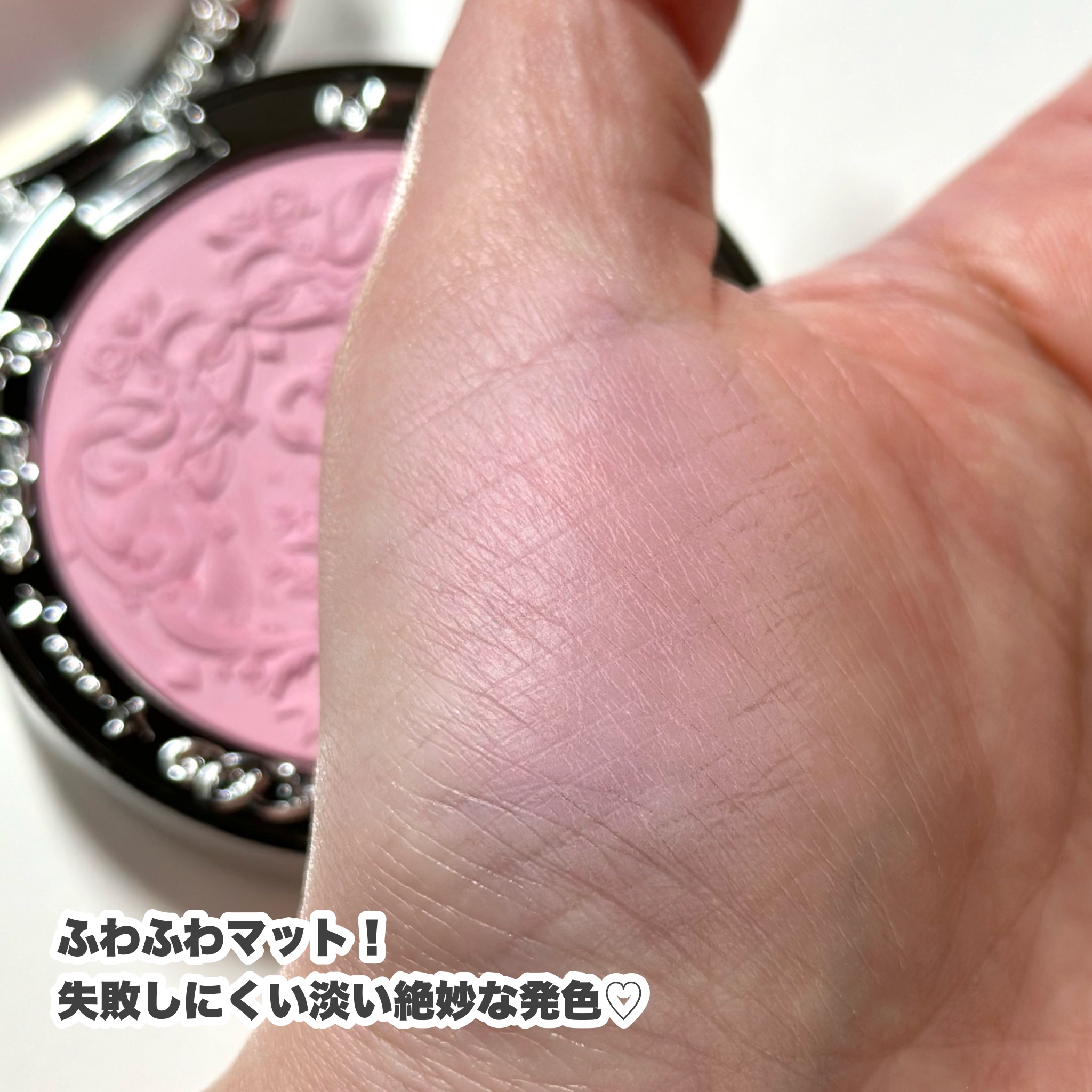 白鳥の刻印が可愛すぎて✨ 使ってるうちになくなっちゃうんですが、気分は上がる↑↑ 粉質はしっとりしていて、 見た目はっきりしたカラーですが、つける前にブラシの余分な粉落としてからつけたら濃すぎないしふんわり仕上がります💕 何より他に類を見ないパケのかわいさがあるので気になる方はぜひ!!
