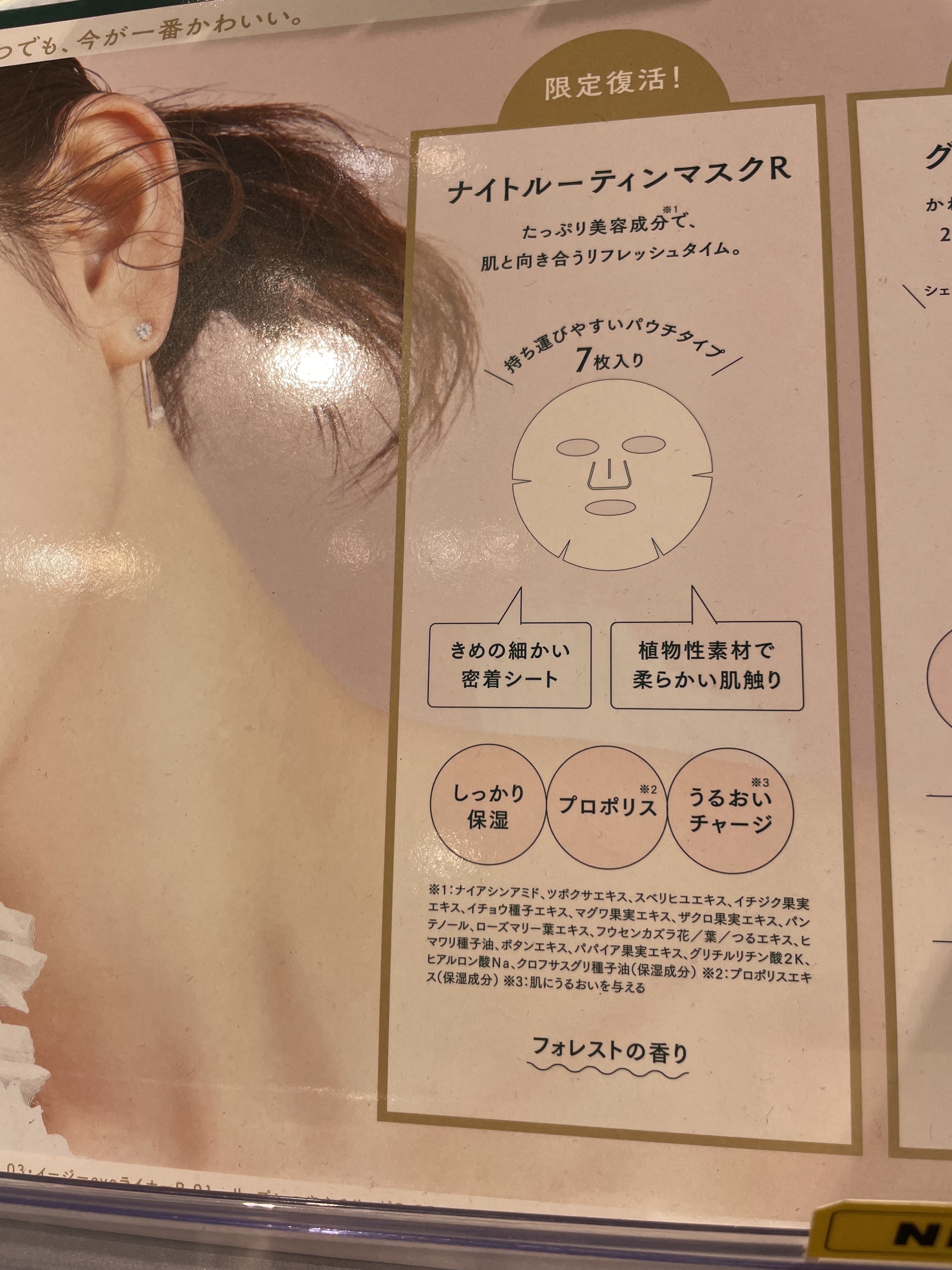 - 限定発売 2023年5月に終売となったナイトルーティンマスクが、この夏、待望の限定復活! 植物性素材で柔らかい肌触り・きめの細かい素材なので、肌にピタッと密着しやすい 保湿力も高く、フォレストの香りでさわやかに 7枚入り&パウチタイプで持ち運びにもとっても便利! たっぷり美容成分*1 で、肌と向き合うリフレッシュタイム。 しっかり保湿プロポリス* 2 うるおいチャージ*3 ・植物性素材で肌触り柔らか ・こだわりの鼻筋カットでピッタリフィット! ・きめ細かい密着シート *1:ナイアシンアミド、ツボクサエキス、スベリヒユエキス、イチジク果実エキス、イチョウ種子エキス、マグワ果実エキス、ザクロ果実エキス、パンテノール、ローズマリー葉エキス、フウセンカズラ花/葉/つるエキス、ヒマワリ種子油、ボタンエキス、パパイア果実エキス、グリチルリチン酸 2K、ヒアルロン酸 Na、クロフサスグリ種子油(保湿成分) *2:プロポリスエキス(保湿成分) *3:肌にうるおいを与える