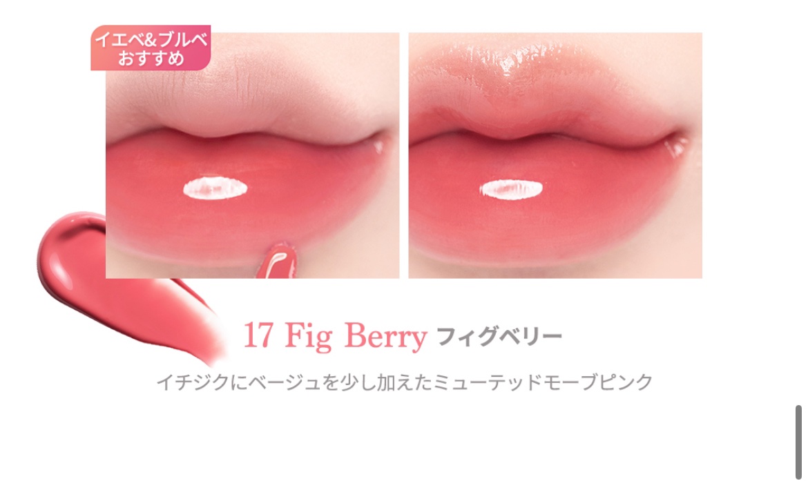 ティッシュオフしてもツヤ感残ってるし 色持ちもよい!!! 個人的に09.10.11.17がおすすめ!! ブルベさんは絶対買って欲しい!!! 09はイエベ向けに見えるけど全然ブルベも使える! 01.08.13.16あたりはイエベ大優勝カラーだと 思います! ただ08から11まで残量が見えないのが マイナスポイント( т т )