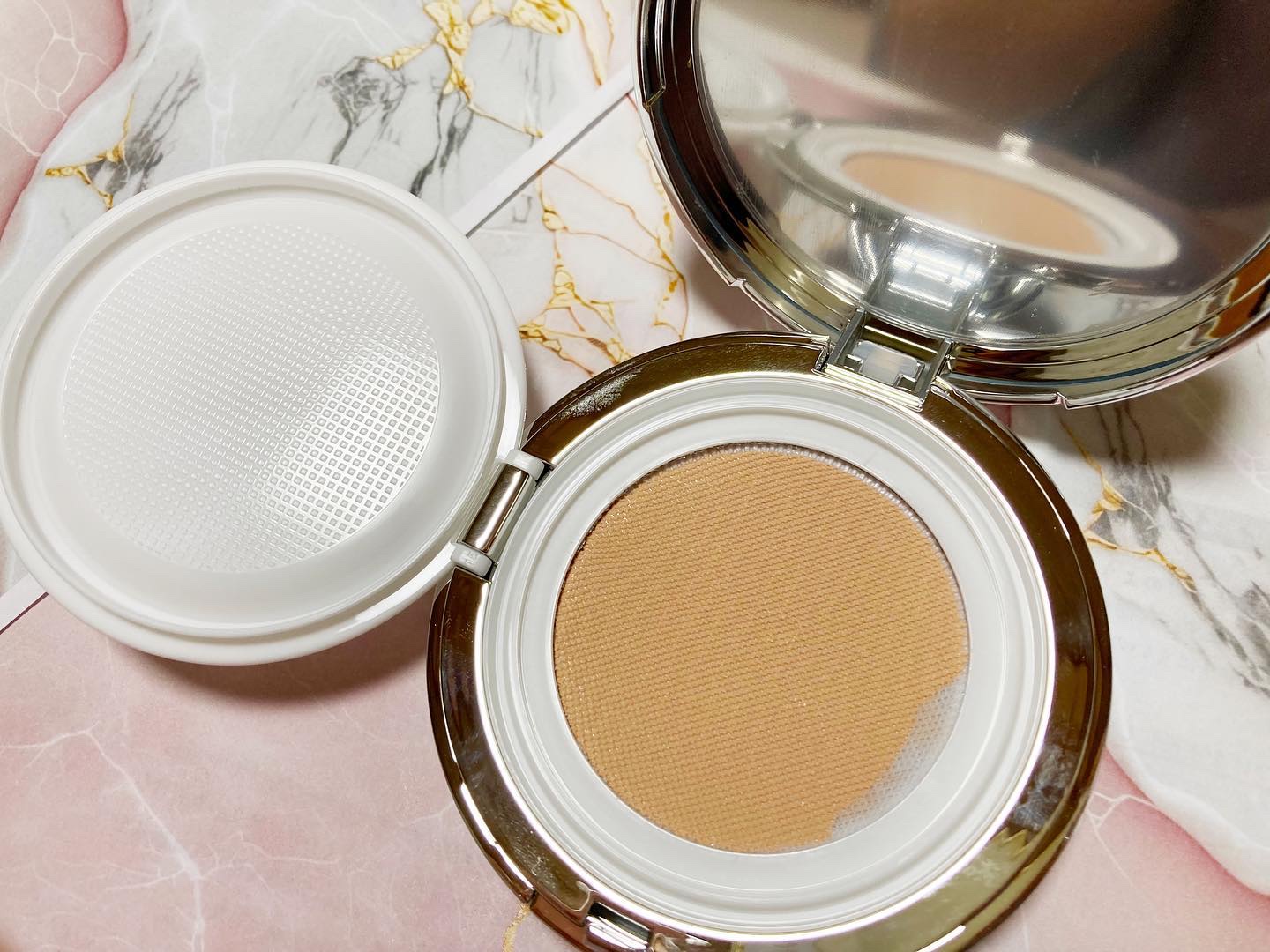 肌の光を極大化させ、屈折率の高いオイルがツヤ感と立体感のある肌を演出してくれるそうです‼️ カラーは3色展開です。21号ライトベージュ/22号ミディアムベージュ/23号ナチュラルベージュ いつもはやや明るめのものを選んでいます。スタッフさんに相談したところ、明るめのお色展開だそうなので、22号ミディアムベージュを選びました。 肌にピタっと密着します。軽いつけ心地で、使いやすかったです♥️ キラキラのパッケージが可愛すぎます✨✨ しずく型のパフは細かな部分まで塗りやすくて使いやすかったです♥️