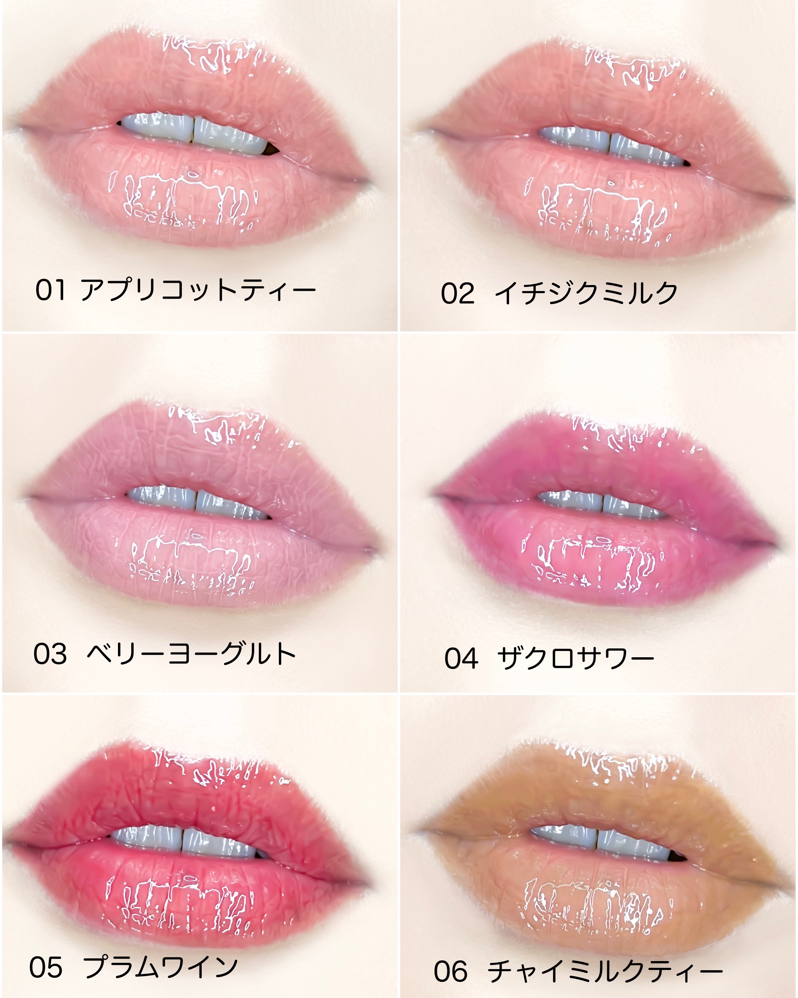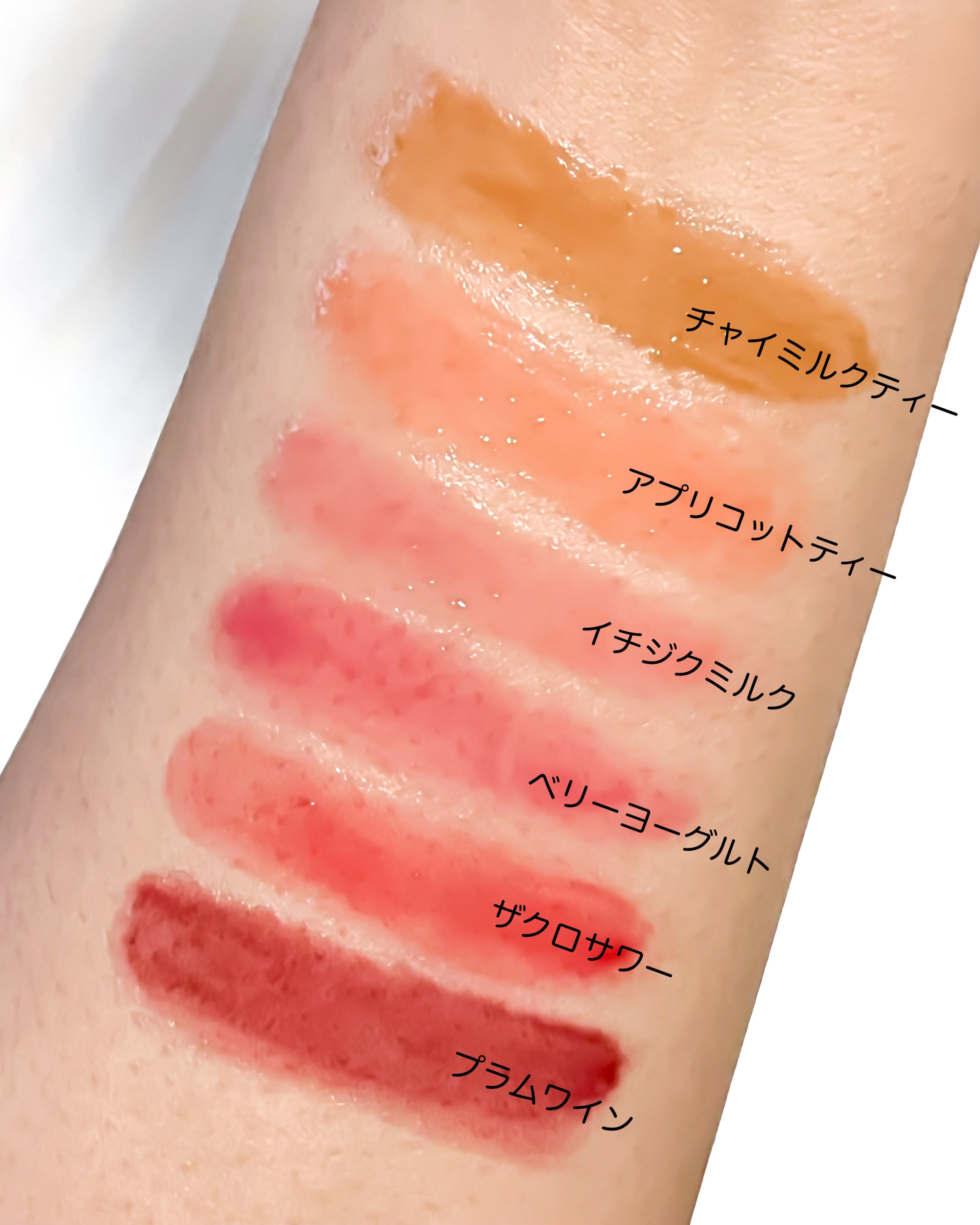 - <01 アプリコットティー> リンゴ酸ジイソステアリル、ダイマージリノール酸ダイマージリノレイルビス(ベヘニル/イソステアリル/フィトステリル)、ビスジグリセリルポリアシルアジペート-2、トリイソステアリン酸ポリグリセリル-2、水添ポリイソブテン、パラフィン、マイクロクリスタリンワックス、ウルシ果皮ロウ、ハチミツエキス、センチフォリアバラ花エキス、マンゴー果実エキス、カニナバラ果実エキス、アーモンド油、アルガニアスピノサ核油、アンズ核油、オリーブ果実油、シア脂、ツバキ種子油、ホホバ種子油、月見草油、BG、トリ(カプリル酸/カプリン酸)グリセリル、1,2-ヘキサンジオール、イソステアリン酸ソルビタン、酢酸トコフェロール、フェノキシエタノール、酸化鉄、酸化チタン、赤202、香料 <02 イチジクミルク> リンゴ酸ジイソステアリル、ダイマージリノール酸ダイマージリノレイルビス(ベヘニル/イソステアリル/フィトステリル)、ビスジグリセリルポリアシルアジペート-2、トリイソステアリン酸ポリグリセリル-2、水添ポリイソブテン、パラフィン、マイクロクリスタリンワックス、ウルシ果皮ロウ、ハチミツエキス、センチフォリアバラ花エキス、マンゴー果実エキス、カニナバラ果実エキス、アーモンド油、アルガニアスピノサ核油、シア脂、オリーブ果実油、アンズ核油、ツバキ種子油、ホホバ種子油、月見草油、BG、トリ(カプリル酸/カプリン酸)グリセリル、1,2-ヘキサンジオール、イソステアリン酸ソルビタン、酢酸トコフェロール、フェノキシエタノール、酸化鉄、酸化チタン、赤202、青1、香料 <03 ベリーヨーグルト> リンゴ酸ジイソステアリル、ダイマージリノール酸ダイマージリノレイルビス(ベヘニル/イソステアリル/フィトステリル)、ビスジグリセリルポリアシルアジペート-2、トリイソステアリン酸ポリグリセリル-2、水添ポリイソブテン、パラフィン、マイクロクリスタリンワックス、ウルシ果皮ロウ、ハチミツエキス、センチフォリアバラ花エキス、マンゴー果実エキス、カニナバラ果実エキス、アーモンド油、アルガニアスピノサ核油、シア脂、オリーブ果実油、アンズ核油、ツバキ種子油、ホホバ種子油、月見草油、BG、トリ(カプリル酸/カプリン酸)グリセリル、1,2-ヘキサンジオール、イソステアリン酸ソルビタン、酢酸トコフェロール、フェノキシエタノール、酸化鉄、酸化チタン、赤202、黄5、香料 <04 ザクロサワー> リンゴ酸ジイソステアリル、ダイマージリノール酸ダイマージリノレイルビス(ベヘニル/イソステアリル/フィトステリル)、ビスジグリセリルポリアシルアジペート-2、トリイソステアリン酸ポリグリセリル-2、水添ポリイソブテン、パラフィン、マイクロクリスタリンワックス、ウルシ果皮ロウ、ハチミツエキス、センチフォリアバラ花エキス、マンゴー果実エキス、カニナバラ果実エキス、アーモンド油、アルガニアスピノサ核油、シア脂、オリーブ果実油、アンズ核油、ツバキ種子油、ホホバ種子油、月見草油、BG、トリ(カプリル酸/カプリン酸)グリセリル、1,2-ヘキサンジオール、イソステアリン酸ソルビタン、酢酸トコフェロール、フェノキシエタノール、黄5、赤202、香料 <05 プラムワイン> リンゴ酸ジイソステアリル、ダイマージリノール酸ダイマージリノレイルビス(ベヘニル/イソステアリル/フィトステリル)、ビスジグリセリルポリアシルアジペート-2、トリイソステアリン酸ポリグリセリル-2、水添ポリイソブテン、パラフィン、マイクロクリスタリンワックス、ウルシ果皮ロウ、ハチミツエキス、センチフォリアバラ花エキス、マンゴー果実エキス、カニナバラ果実エキス、アーモンド油、アルガニアスピノサ核油、シア脂、オリーブ果実油、アンズ核油、ツバキ種子油、ホホバ種子油、月見草油、BG、トリ(カプリル酸/カプリン酸)グリセリル、1,2-ヘキサンジオール、イソステアリン酸ソルビタン、酢酸トコフェロール、フェノキシエタノール、酸化鉄、赤202、青1、香料 <06 チャイミルクティー> リンゴ酸ジイソステアリル、ダイマージリノール酸ダイマージリノレイルビス(ベヘニル/イソステアリル/フィトステリル)、ビスジグリセリルポリアシルアジペート-2、トリイソステアリン酸ポリグリセリル-2、水添ポリイソブテン、パラフィン、マイクロクリスタリンワックス、ハチミツエキス、センチフォリアバラ花エキス、マンゴー果実エキス、カニナバラ果実エキス、アーモンド油、アルガニアスピノサ核油、シア脂、オリーブ果実油、アンズ核油、ツバキ種子油、ホホバ種子油、月見草油、BG、トリ(カプリル酸/カプリン酸)グリセリル、水、1,2-ヘキサンジオール、イソステアリン酸ソルビタン、BHT、酢酸トコフェロール、フェノキシエタノール、酸化チタン、酸化鉄、香料 <21 ダーティチョコ> リンゴ酸ジイソステアリル、ダイマージリノール酸ダイマージリノレイルビス(ベヘニル/イソステアリル/フィトステリル)、ビスジグリセリルポリアシル
