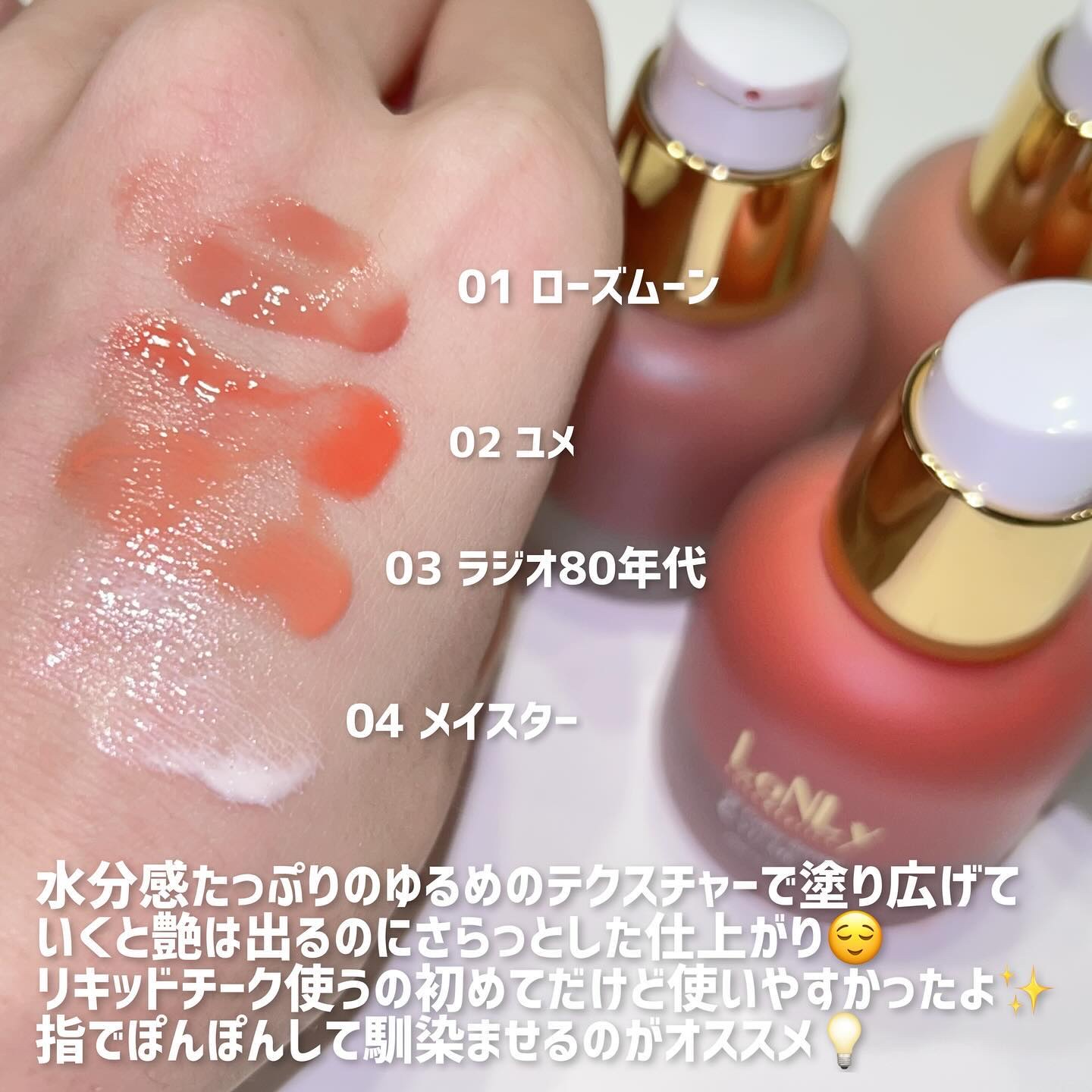 - <01 Rose Moon> 水、メチルトリメチコン、ジメチコン、エチルヘキサン酸セチル、イソノナン酸イソノニル、エタノール、ポリブテン、グリセリン、PEG-10ジメチコン、ペンチレングリコール、(ビニルジメチコン/メチコンシルセスキオキサン)クロスポリマー、1,2-ヘキサンジオール、加水分解フィブロイン、グリセリルグルコシド、ビスジグリセリルポリアシルアジペート-2、ジステアルジモニウムヘクトライト、硫酸Mg、マイカ(CI77019)、酸化チタン(CI77891)、酸化鉄(CI77491)、グンジョウ(CI77007)、赤226(CI73360)、酸化鉄(CI77492)、酸化鉄(CI77499)、BG、トリエトキシカプリリルシラン、オキシ水酸化Al、セチルPEG/PPG-10/1ジメチコン、クワ葉エキス、エチルヘキシルグリセリン、エチレンジアミンジコハク酸3Na <02 YU-ME> 水、メチルトリメチコン、ジメチコン、エチルヘキサン酸セチル、イソノナン酸イソノニル、エタノール、ポリブテン、グリセリン、PEG-10ジメチコン、ペンチレングリコール、(ビニルジメチコン/メチコンシルセスキオキサン)クロスポリマー、1,2-ヘキサンジオール、加水分解フィブロイン、グリセリルグルコシド、ビスジグリセリルポリアシルアジペート-2、ジステアルジモニウムヘクトライト、硫酸Mg、マイカ(CI77019)、赤226(CI73360)、酸化チタン(CI77891)、酸化鉄(CI77492)、酸化鉄(CI77491)、グンジョウ(CI77007)、酸化鉄(CI77499)、BG、トリエトキシカプリリルシラン、オキシ水酸化Al、セチルPEG/PPG-10/1ジメチコン、マグワ葉エキス、エチルヘキシルグリセリン、エチレンジアミンジコハク酸3Na <03 Radio 80’s > 水、メチルトリメチコン、ジメチコン、エチルヘキサン酸セチル、イソノナン酸イソノニル、エタノール、ポリブテン、グリセリルグルコシド、PEG-10ジメチコン、1,2-ヘキサンジオール、グリセリン、(ビニルジメチコン/メチコンシルセスキオキサン)クロスポリマー、ペンチレングリコール、BG、加水分解フィブロイン、ジステアルジモニウムヘクトライト、ビスジグリセリルポリアシルアジペート-2、硫酸Mg、酸化チタン(CI77891)、酸化鉄(CI77491)、酸化鉄(CI77499)、セチルPEG/PPG-10/1ジメチコン、クワ葉エキス、エチルヘキシルグリセリン、エチレンジアミンジコハク酸3Na <04 May Star> 水、メチルトリメチコン、ジメチコン、エチルヘキサン酸セチル、イソノナン酸イソノニル、エタノール、ポリブテン、グリセリルグルコシド、PEG-10ジメチコン、1,2-ヘキサンジオール、グリセリン、(ビニルジメチコン/メチコンシルセスキオキサン)クロスポリマー、ペンチレングリコール、BG、加水分解フィブロイン、ジステアルジモニウムヘクトライト、ビスジグリセリルポリアシルアジペート-2、硫酸Mg、酸化チタン(CI77891)、酸化鉄(CI77492)、酸化鉄(CI77491)、酸化鉄(CI77499)、セチルPEG/PPG-10/1ジメチコン、クワ葉エキス、エチルヘキシルグリセリン、エチレンジアミンジコハク酸3Na