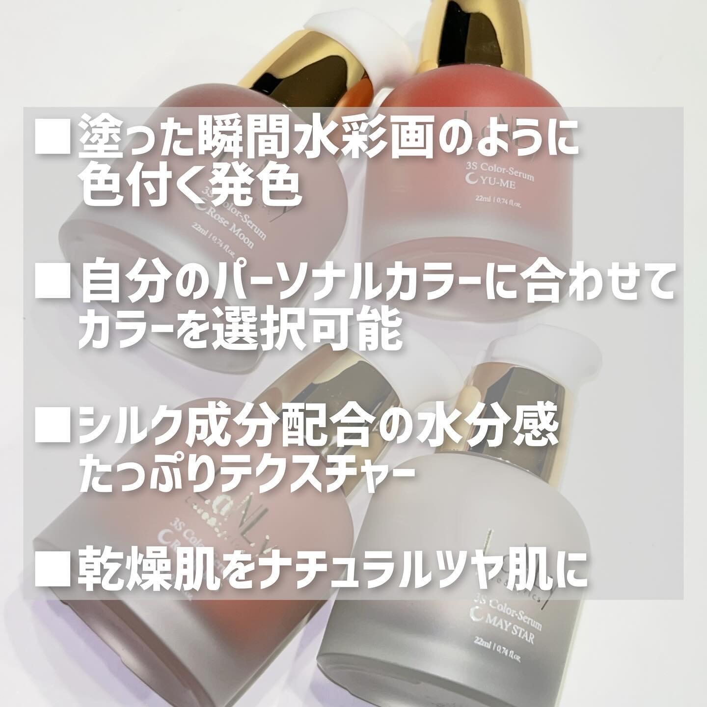 - スキンケアとコスメが組み合わさった新カテゴリー化粧品の「3Sカラーセラム」メイクの上から塗ってチークとして使うことができるのはもちろん、すっぴんの上から塗ることで自然な血色感を演出。4種全てクラシック音楽がモチーフになっており、性別問わず誰でもお使いいただきやすい商品となっております。