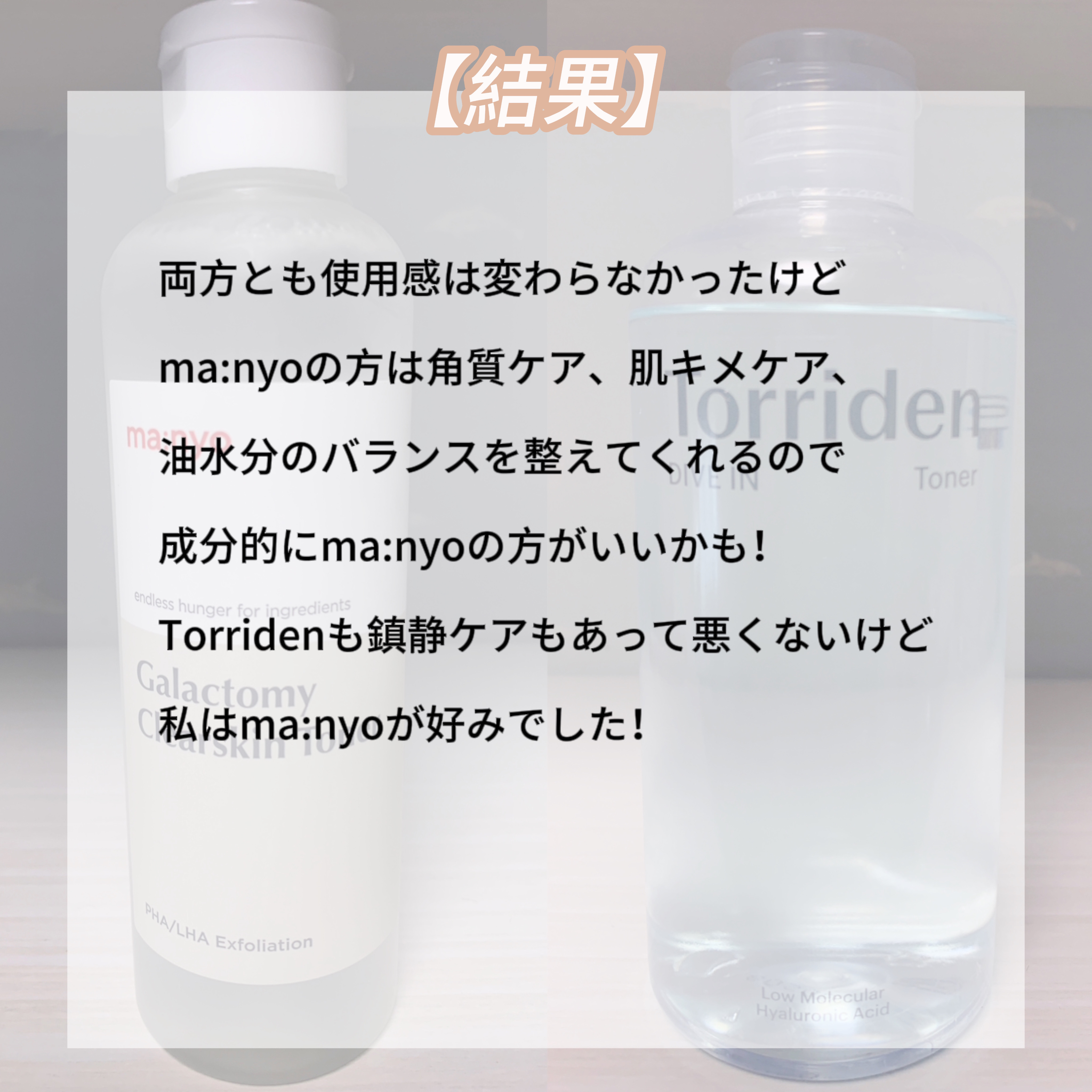どちらも良かったのですが、ma:nyoの方が色々なケアができるのでいいかなと思います! 両方とも拭き取り化粧水としても使えます。 レチノールやビタミンCが入ったの美容液を併用しない方が良いかもしれないです💦